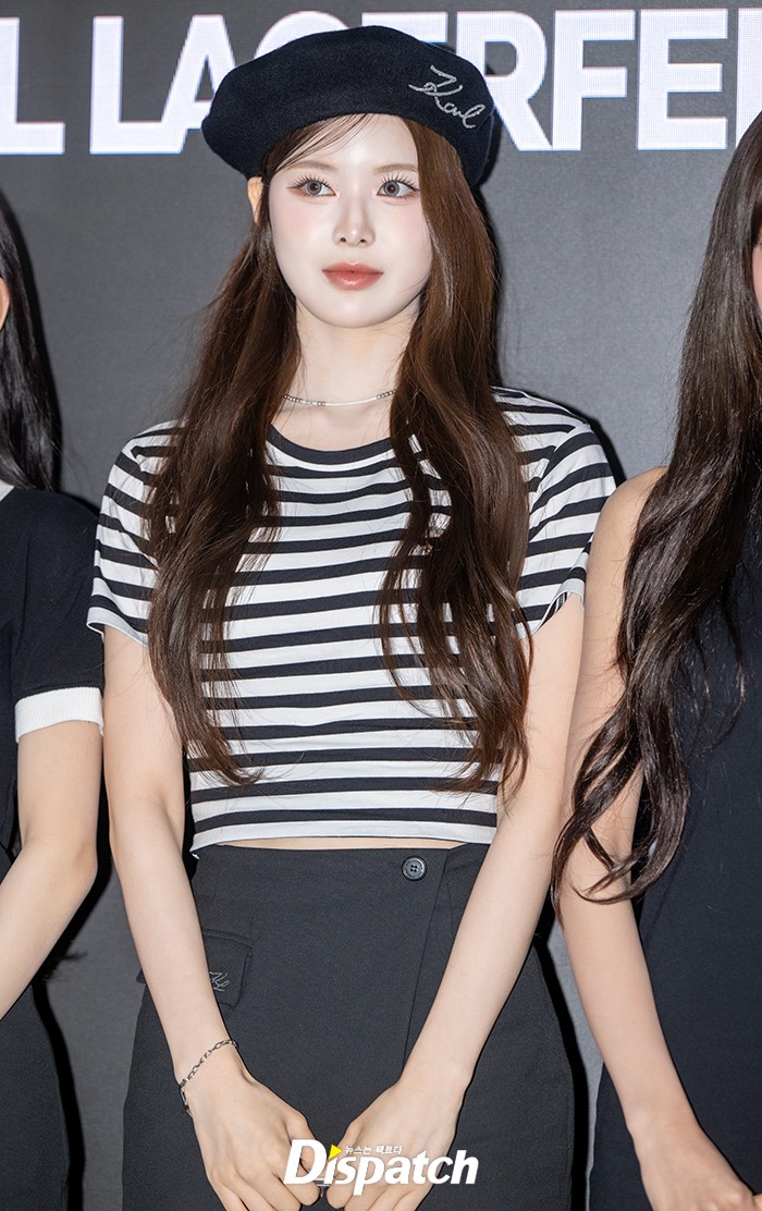 '이즈나' 방지민은 스트라이프 티셔츠와 미니스커트로 맵시를 뽐냈다. 아름다운 미모로 시선을 사로잡았다.