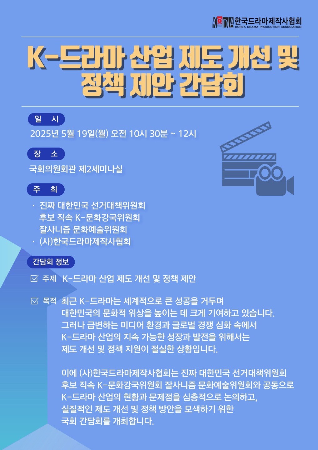 한국드라마제작사협회 측이 19일 국회의원회관에서 'K-드라마 산업 제도 개선 및 정책 제안 간담회'를 열었다. 위기를 타파할 실질적 정책 대안을 논의했다.