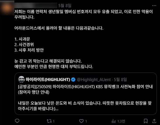 먼저 하이라이트 공식 팬클럽 라이트 5기 가입자 일부의 개인정보 유출 사실과 관련하여 진심으로 사과드립니다.