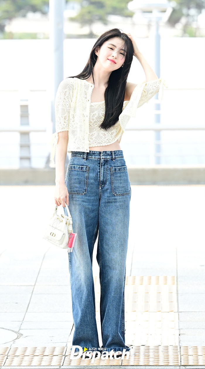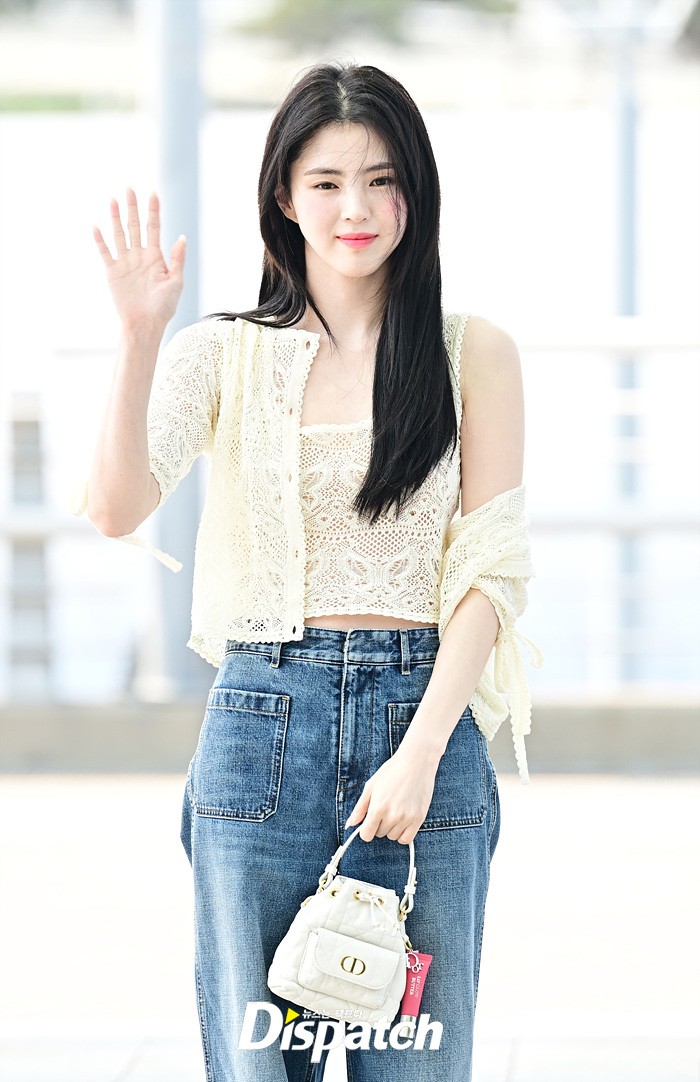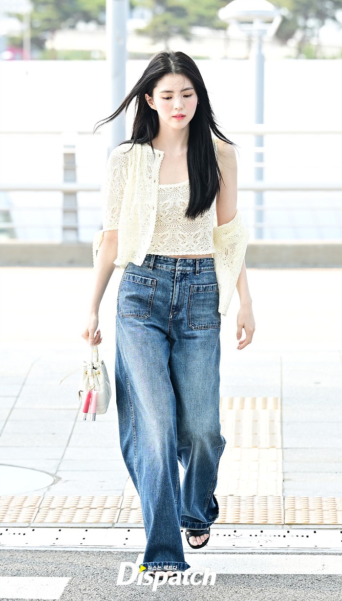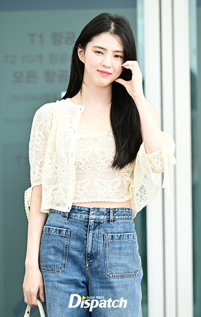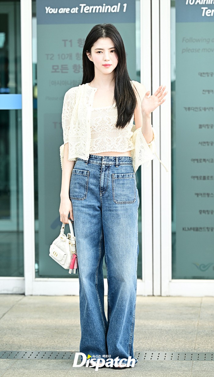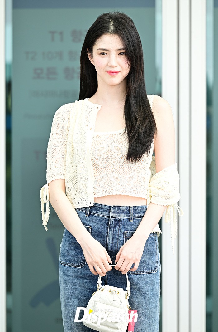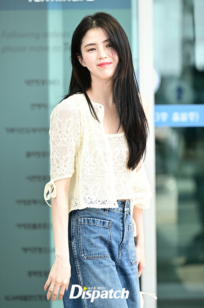 한소희는 화이트 블라우스와 데님진으로 캐주얼한 공항패션을 연출했다. 인형같은 비주얼과 러블리한 미소가 돋보였다.