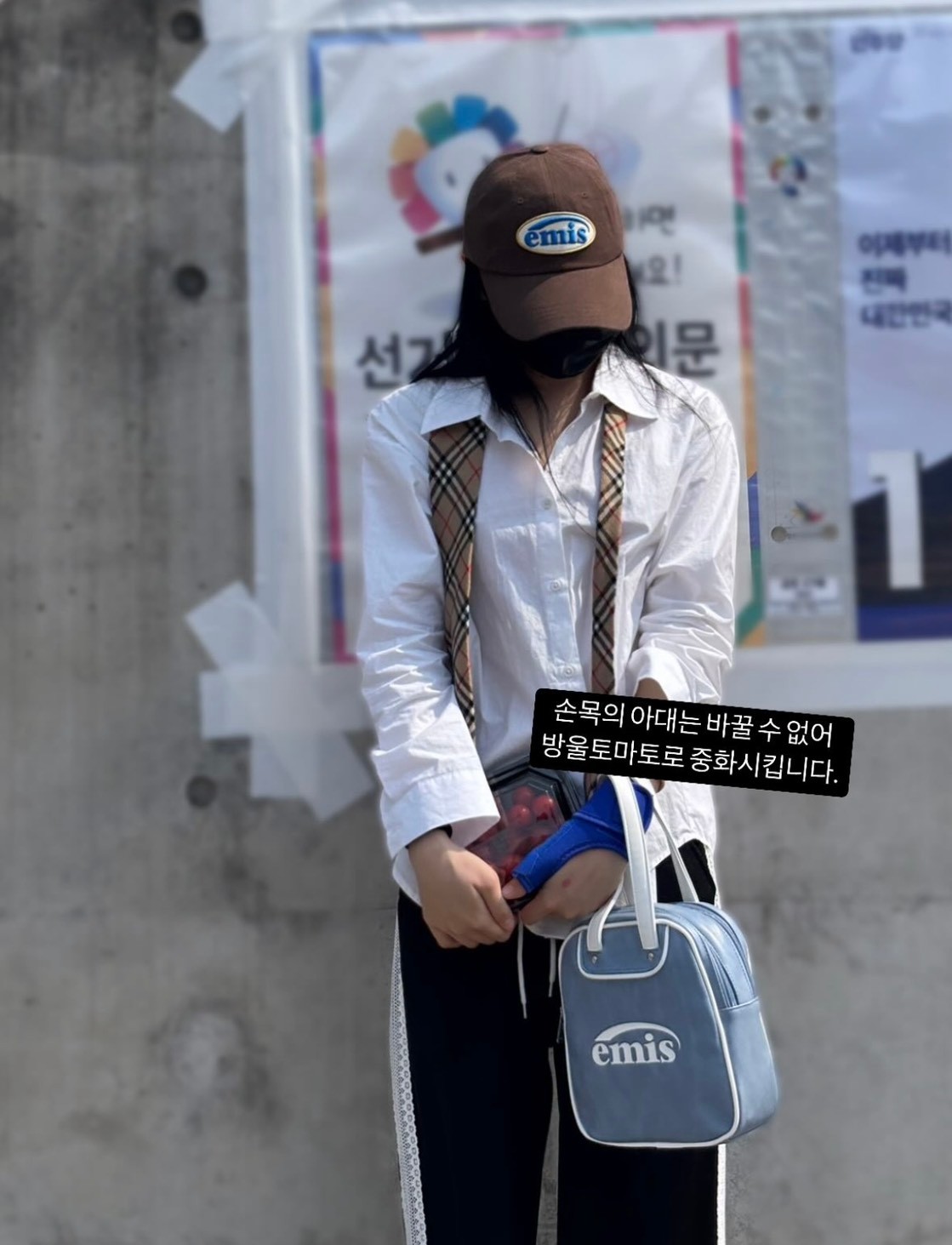 이채연은 "사전투표 날이다. 주거지 상관없이 아무 곳에서나 투표 가능하다"고 소개하며 "손목 아대는 바꿀 수 없어, 방울토마토로 중화시킨다"고 적어 웃음을 안겼다.