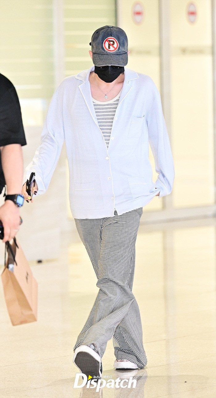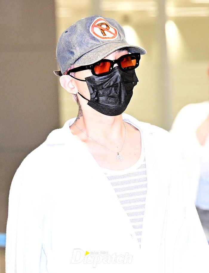 지드래곤은 오버핏 셔츠에 와이드진을 매치했다. 모자와 마스크에도 강렬한 눈빛이 돋보였다.