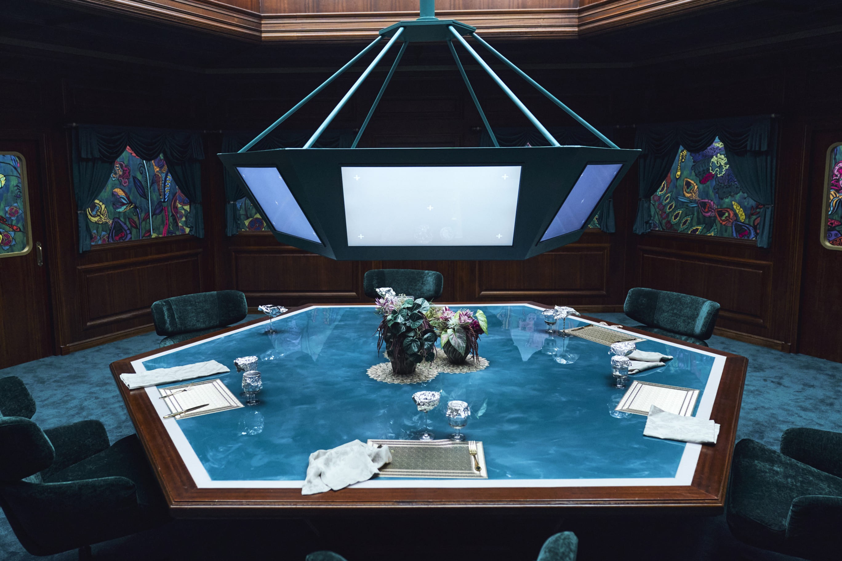 VIP들이 식사하는 공간도 새롭다. 채 감독은 "식탁을 육각형으로 구성했다. 굉장히 단단한 도형이고, 신탁 같은 느낌이 있어 그 의미를 표현하고 싶었다"고 소개했다.