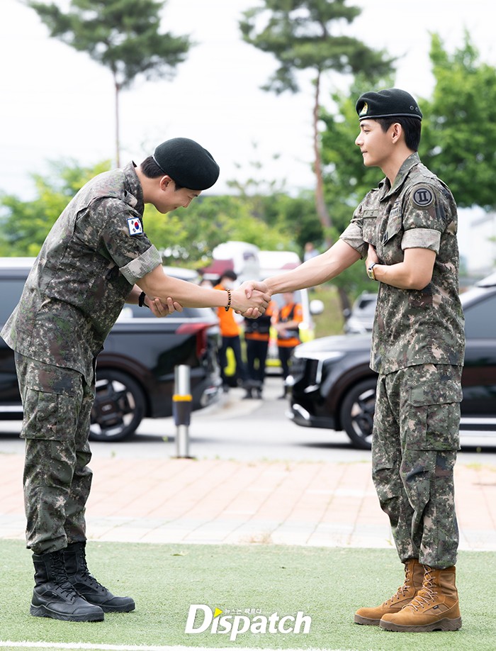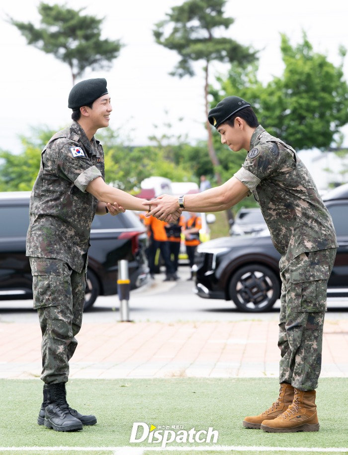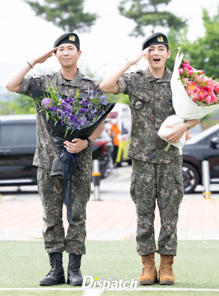 [Dispatchㅣ춘천(강원)=이승훈기자] '방탄소년단(BTS)' RM(본명 김남준)과 뷔(본명 김태형)가 육군 복무를 마치고 10일 오전 강원도 춘천 신북읍체육공원에서 전역식을 가졌다.