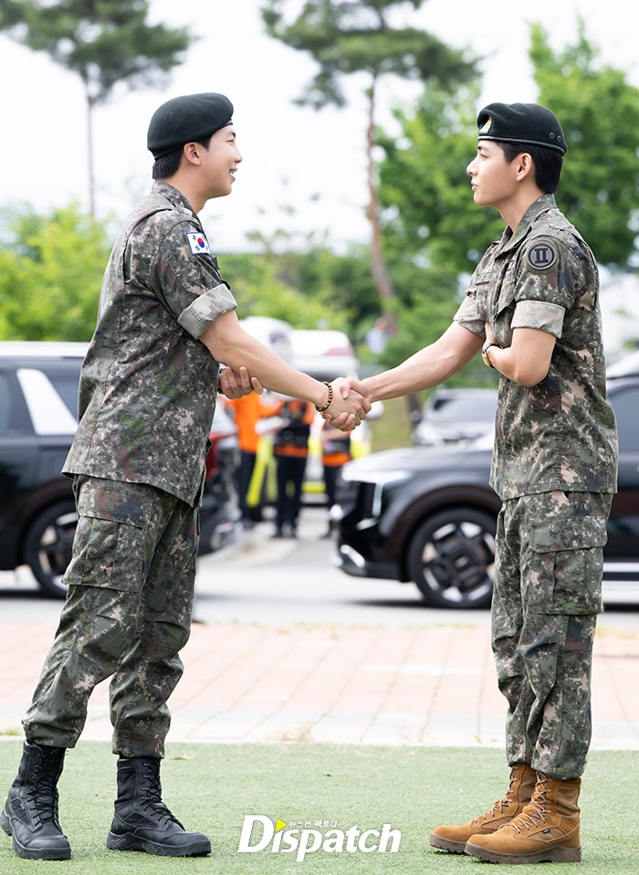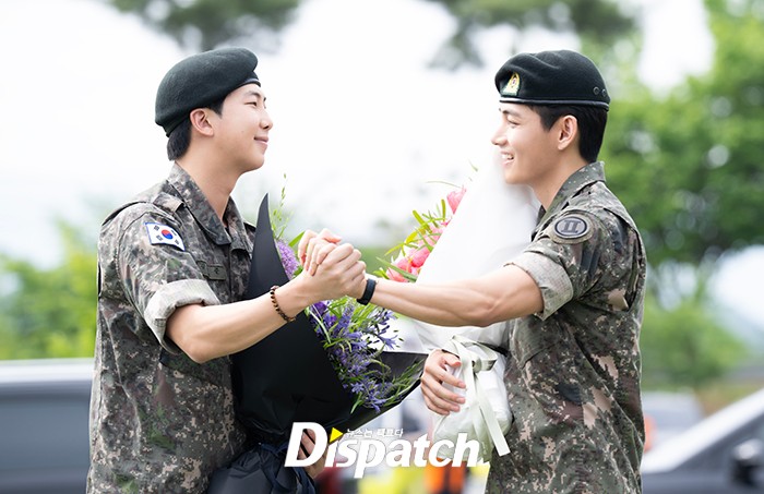 RM과 뷔는 전역식 중 서로 안아주며 축하해줬다. 환한 웃음으로 행사를 마쳤다.
