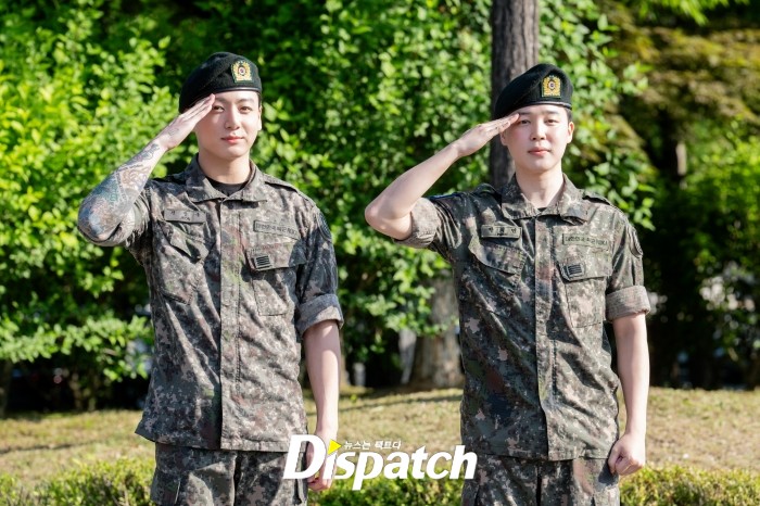 [Dispatchㅣ연천(경기)=송효진기자] '방탄소년단(BTS)' 지민과 정국이 육군 복무를 마치고 11일 오전 경기도 연천 연천공설운동장에서 전역식을 가졌다.