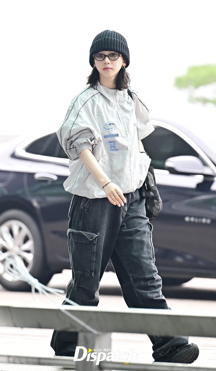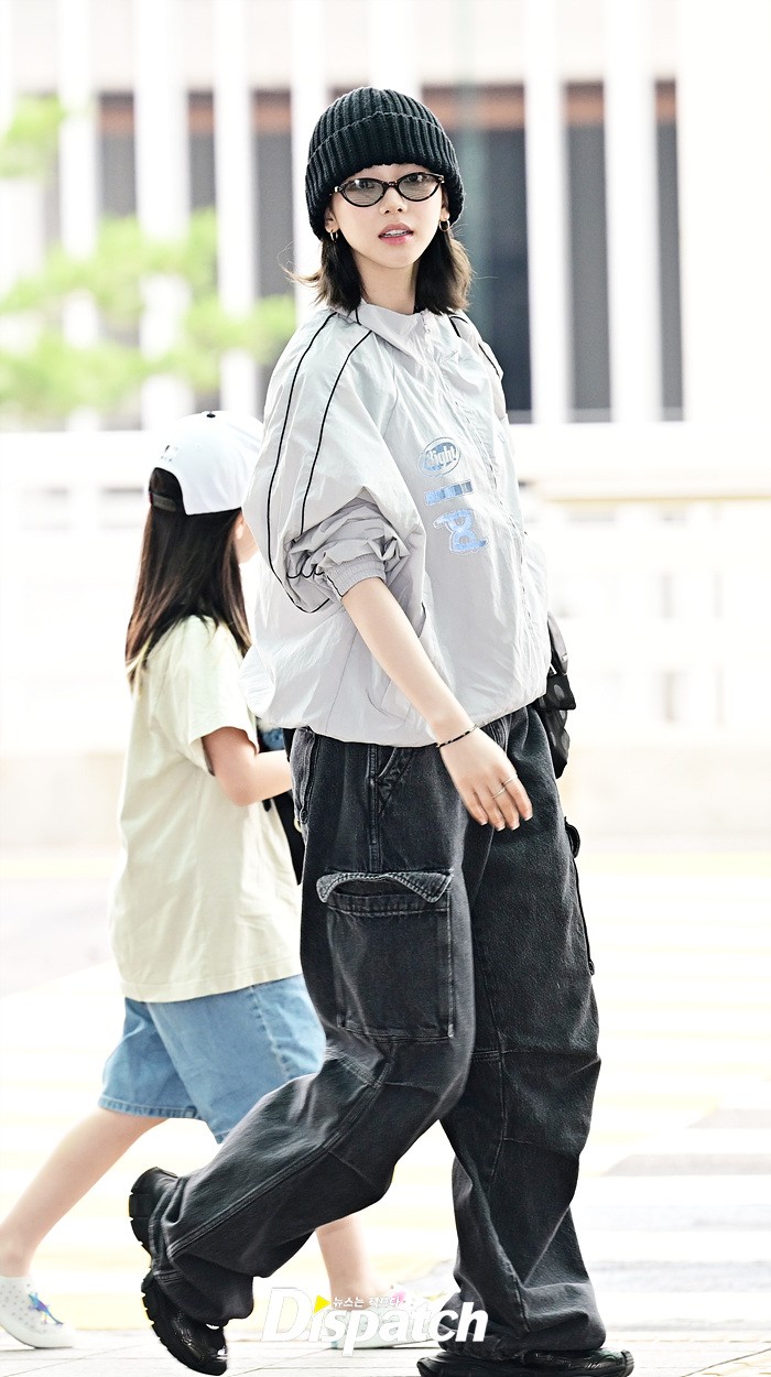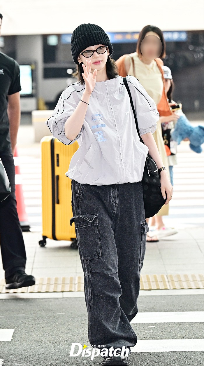 카리나는 비니와 선글라스, 카고팬츠로 힙한 공항패션을 완성했다. 이른 아침에도 눈부신 미모가 돋보였다.