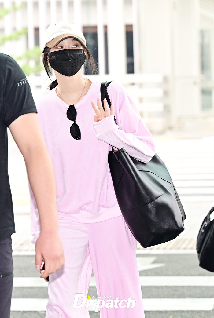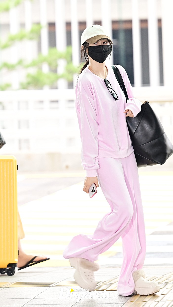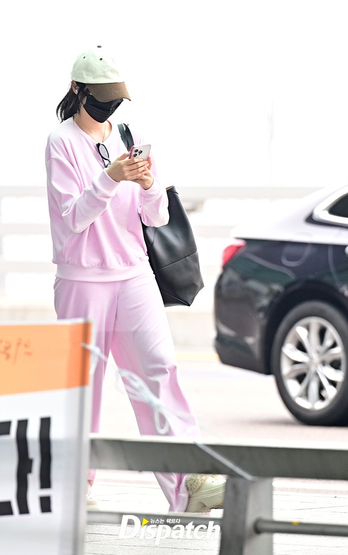 지젤은 모자와 마스크에도 청순한 비주얼로 시선을 모았다. 핑크 컬러의 트레이닝룩으로 연출한 심플한 공항패션도 돋보였다.