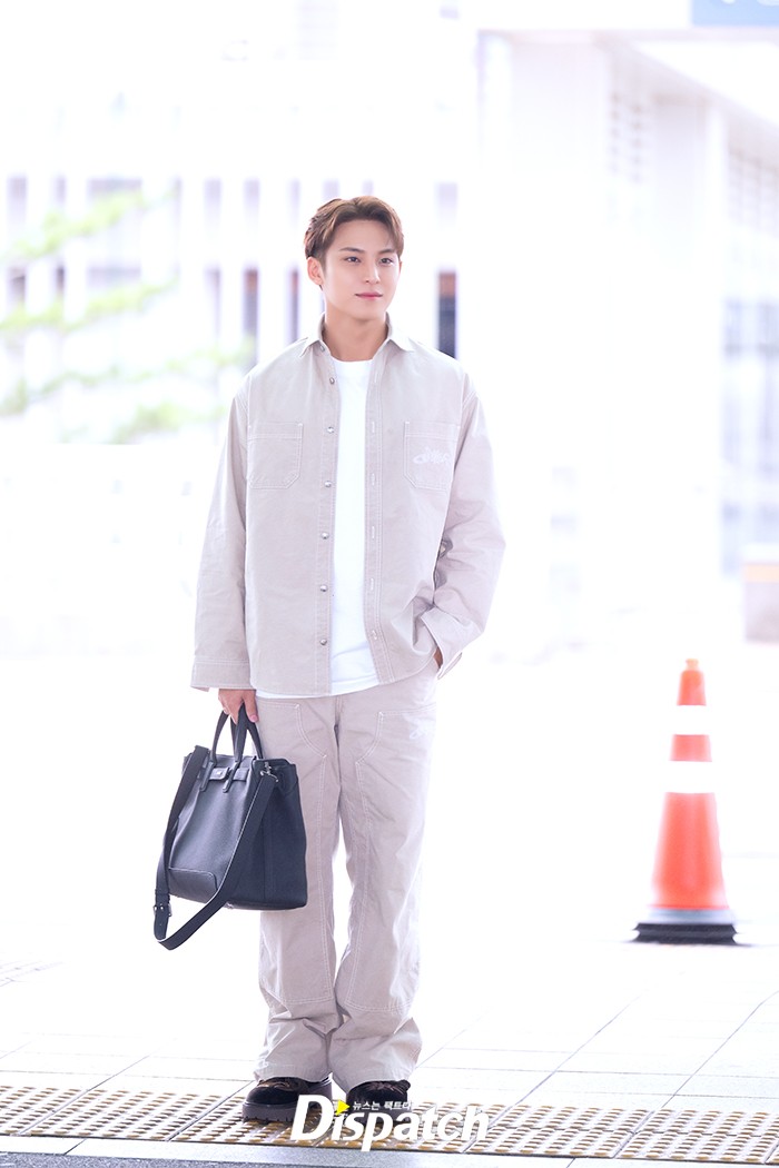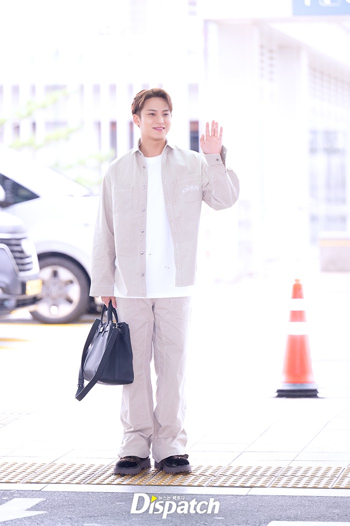 민규는 베이지 데님 셋업으로 댄디한 공항패션을 연출했다. 조각같은 비주얼이 돋보였다.