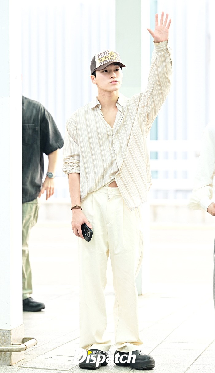 산은 아침부터 훈훈한 비주얼로 여심을 사로 잡았다. 공항에 모인 팬들을 위해 다양한 포즈로 감사의 마음을 전했다.