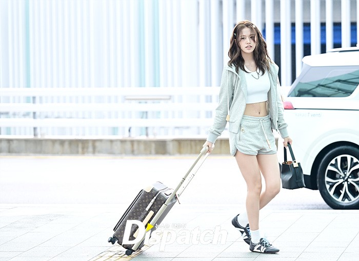 안유진은 파격적인 의상으로 눈길을 끌었다. 심플한 후드집업과 핫팬츠, 배꼽을 드러낸 탑 의상을 입고 출국장을 나섰다.