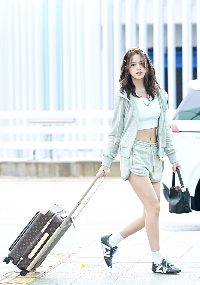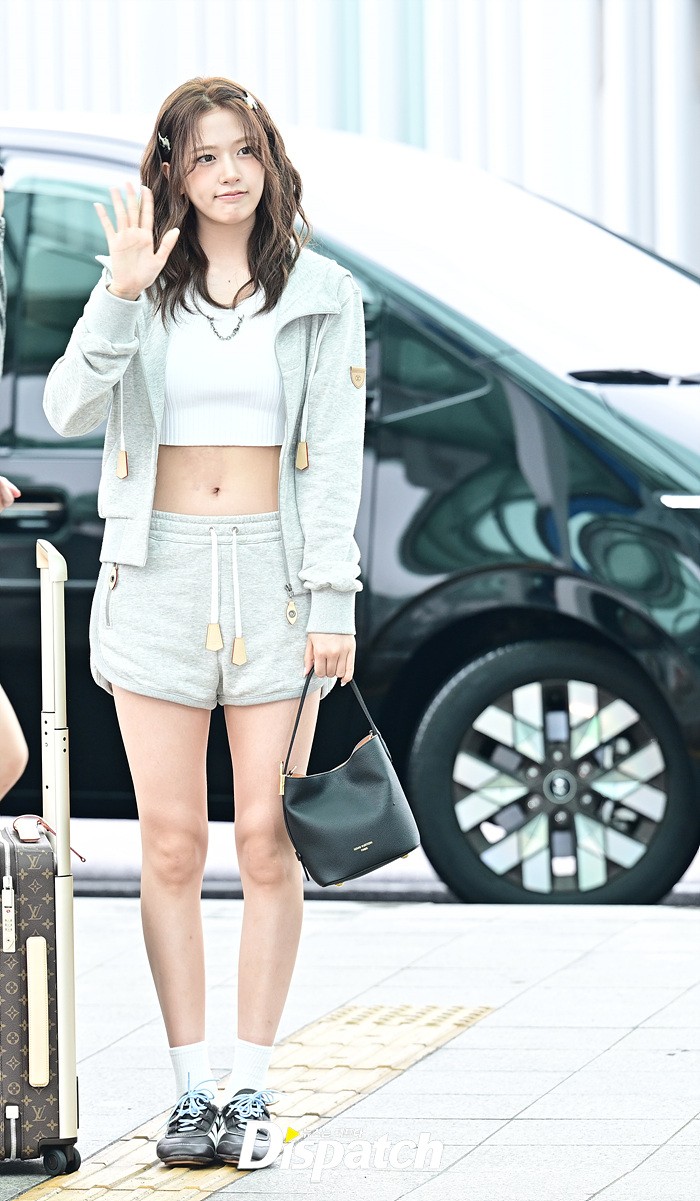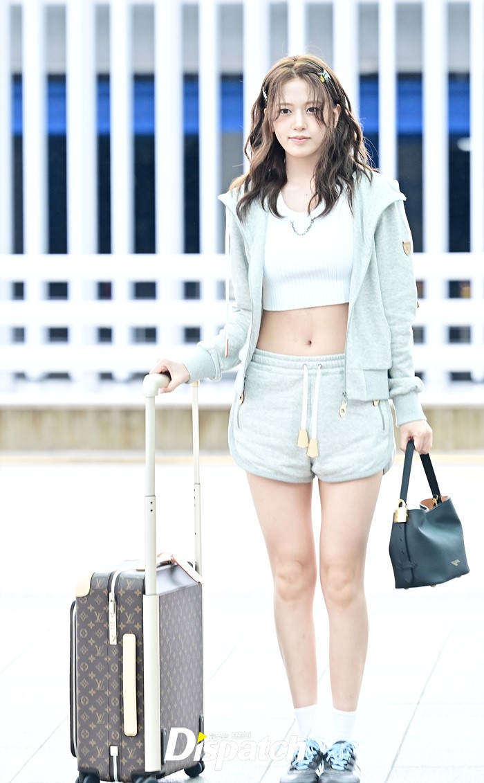 안유진은 파격적인 의상으로 눈길을 끌었다. 심플한 후드집업과 핫팬츠, 배꼽을 드러낸 탑 의상을 입고 출국장을 나섰다.