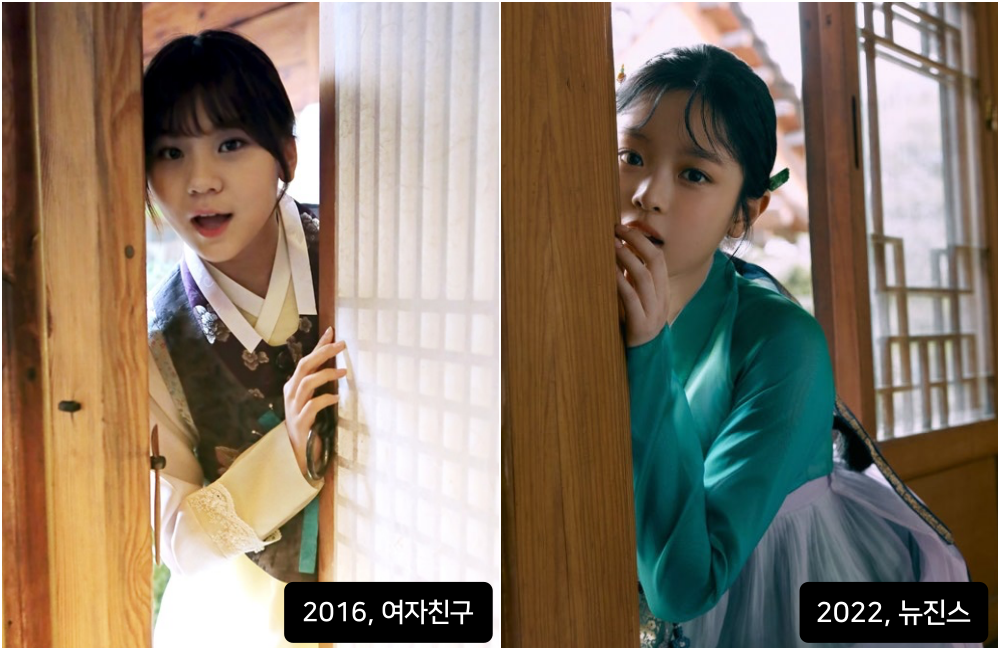빌리프랩은 여자친구(2016)와 뉴진스(2022)를 비교했다. 교복 착용, 한복 화보, 뮤비 영상 등을 나열했다. 걸그룹 콘셉트의 유사성을 보여주기 위한 예시였다.