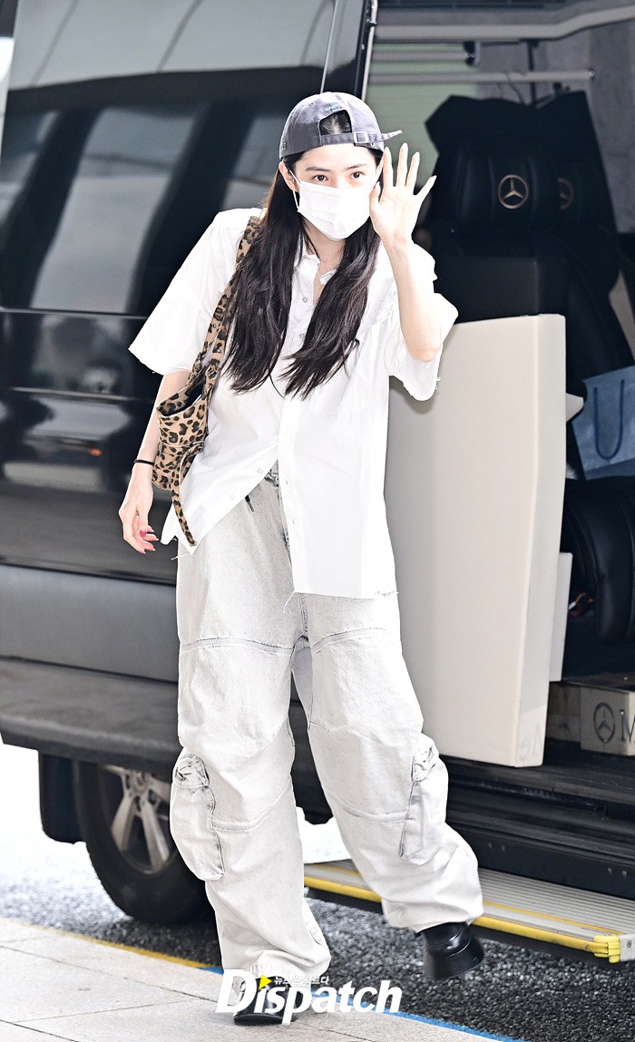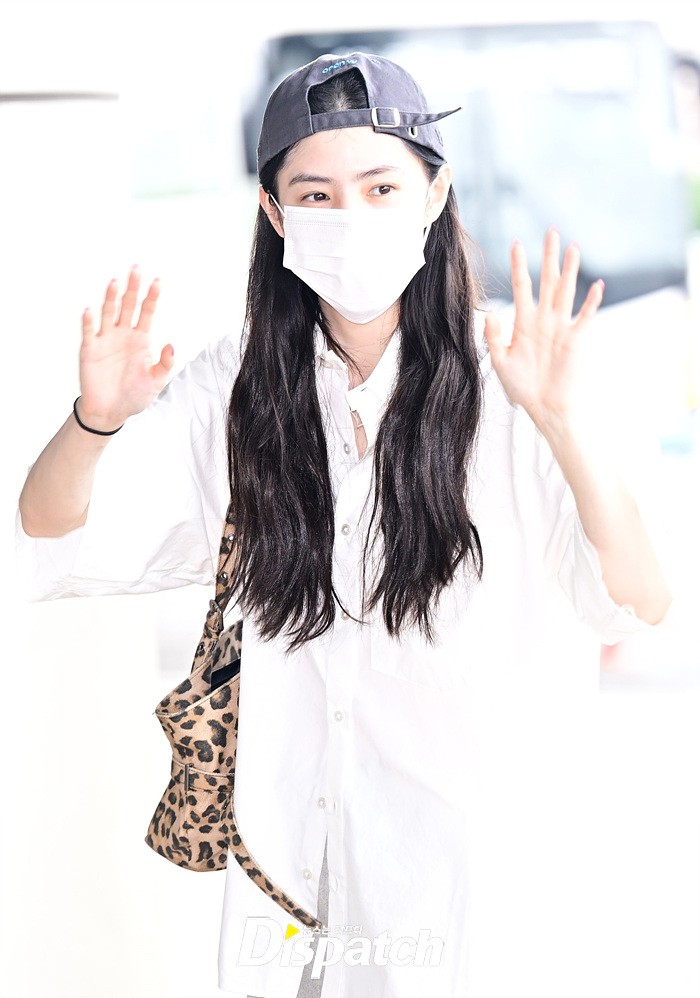 한소희는 화이트 셔츠와 카고팬츠, 모자로 힙한 공항패션을 완성했다. 마스크에도 청초한 비주얼이 돋보였다.