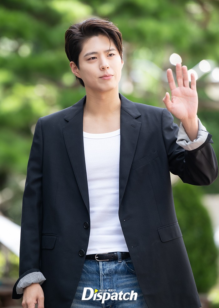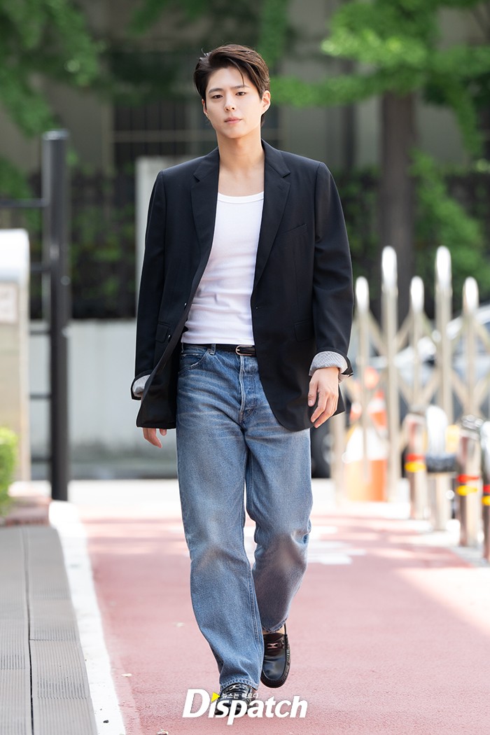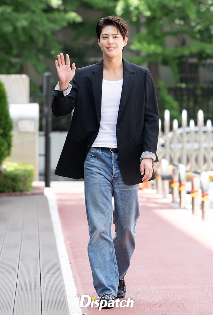 박보검은 네이비 자켓과 청바지로 멋진 스타일을 연출했다.