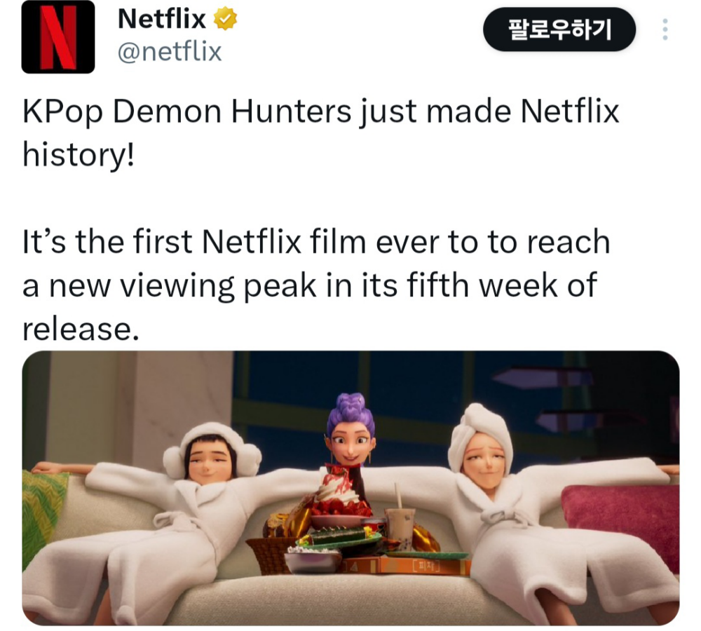 넷플릭스는 23일 SNS에 "'케데헌'이 넷플릭스 영화 역사상 최초로, 공개 5주 차에 시청률 최고치를 갱신한 작품이 됐다"고 공식 발표했다.
