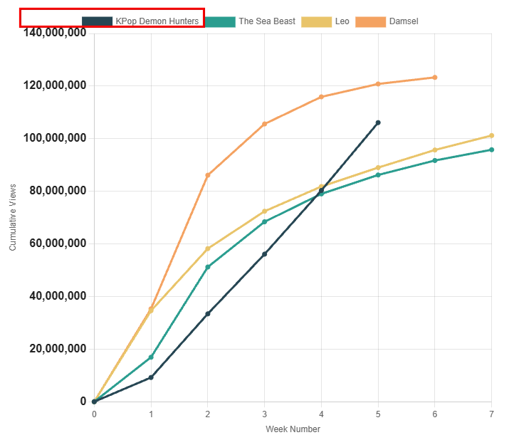 '케데헌'은 영어와 비영어, 영화, 쇼 등 전체를 통틀어 가장 많이 시청한 콘텐츠로 집계됐다. 오픈 5주 차에도 2,580만 시청 수를 기록했다.