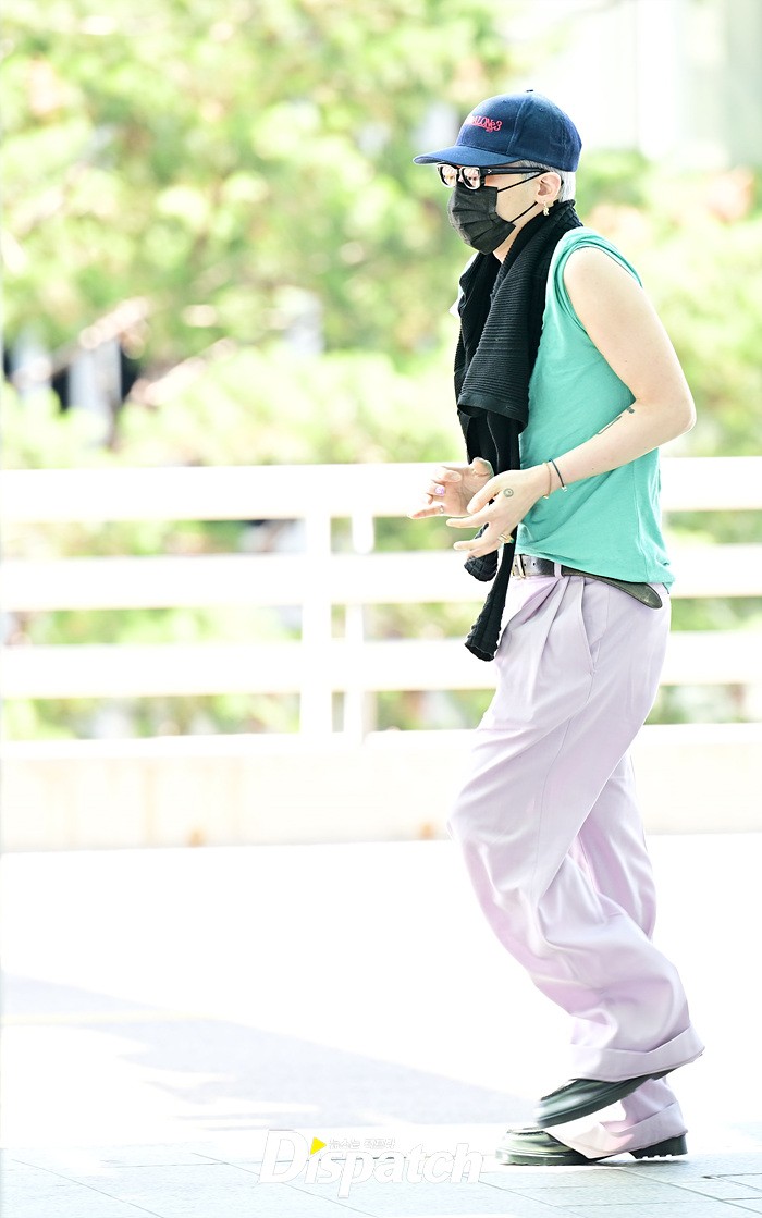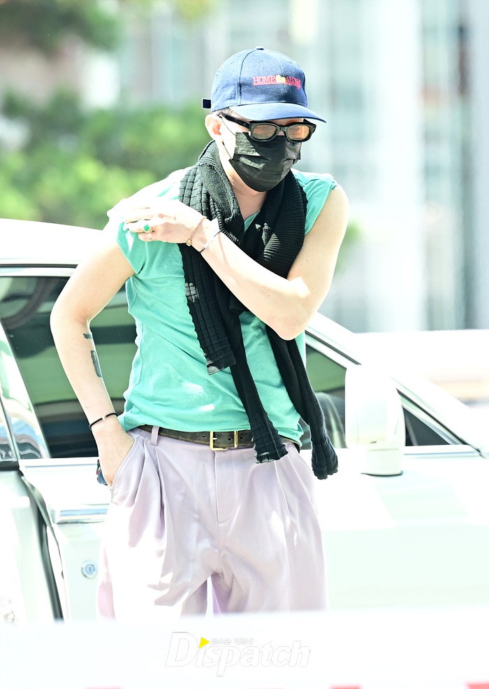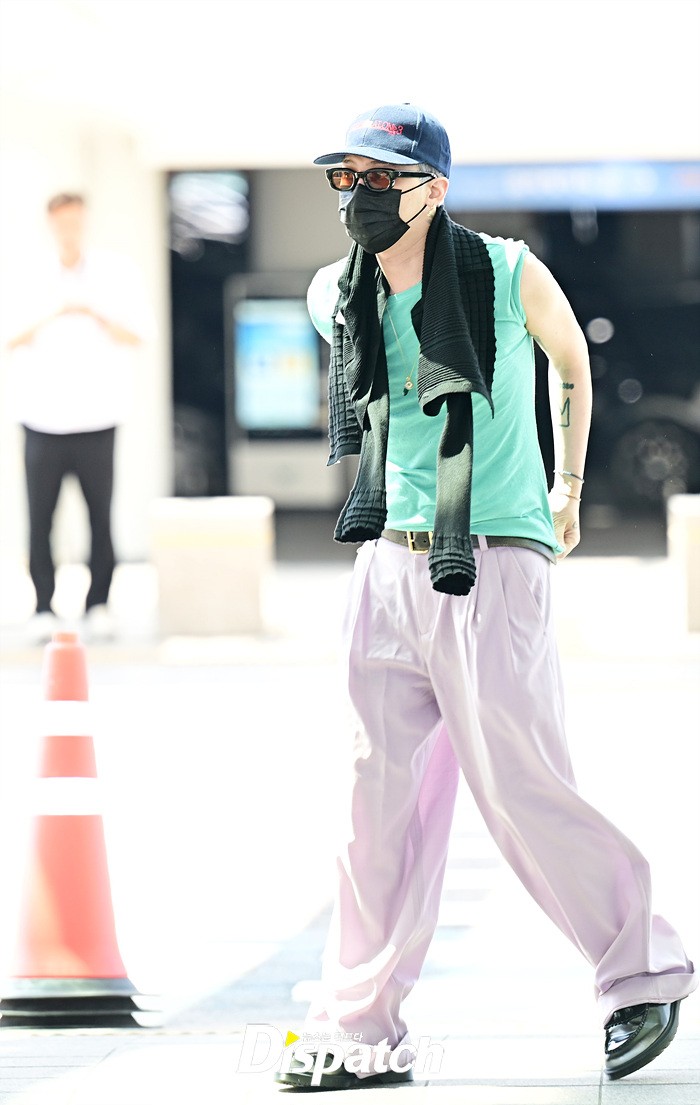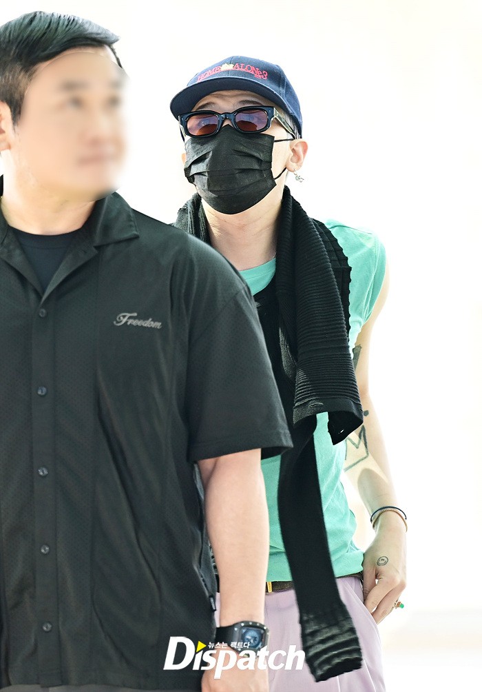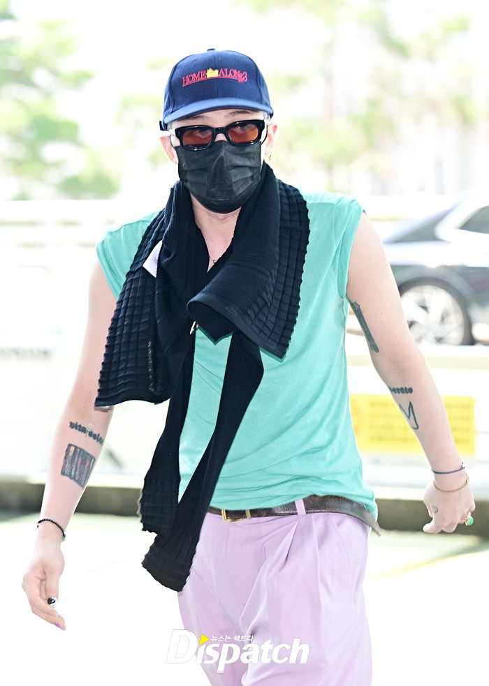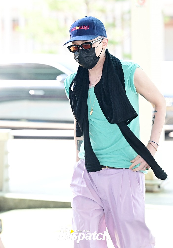 지드래곤은 민트 컬러의 티셔츠와 퍼플 팬츠로 화려한 공항패션을 완성했다. 모자와 마스크에도 강렬한 카리스마가 돋보였다.