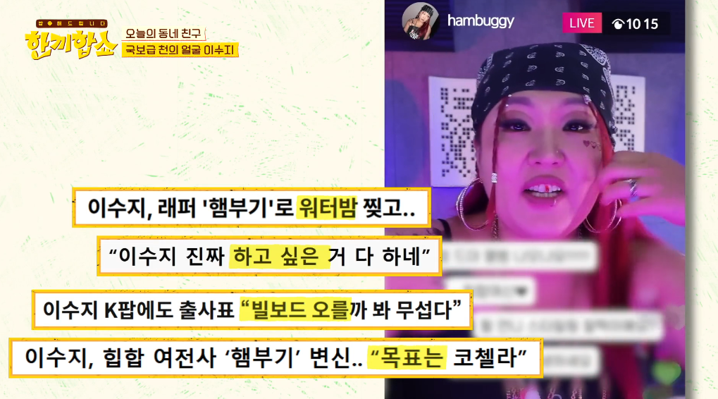 이수지의 하드캐리였다. 그는 김희선과 탁재훈을 만나자마자 상황극을 시작했다. 젠지 여고생에 빙의하고, 음악 선생님처럼 성악 톤으로 교가를 불렀다. 래퍼 '햄부기' 부캐도 꺼내들었다.