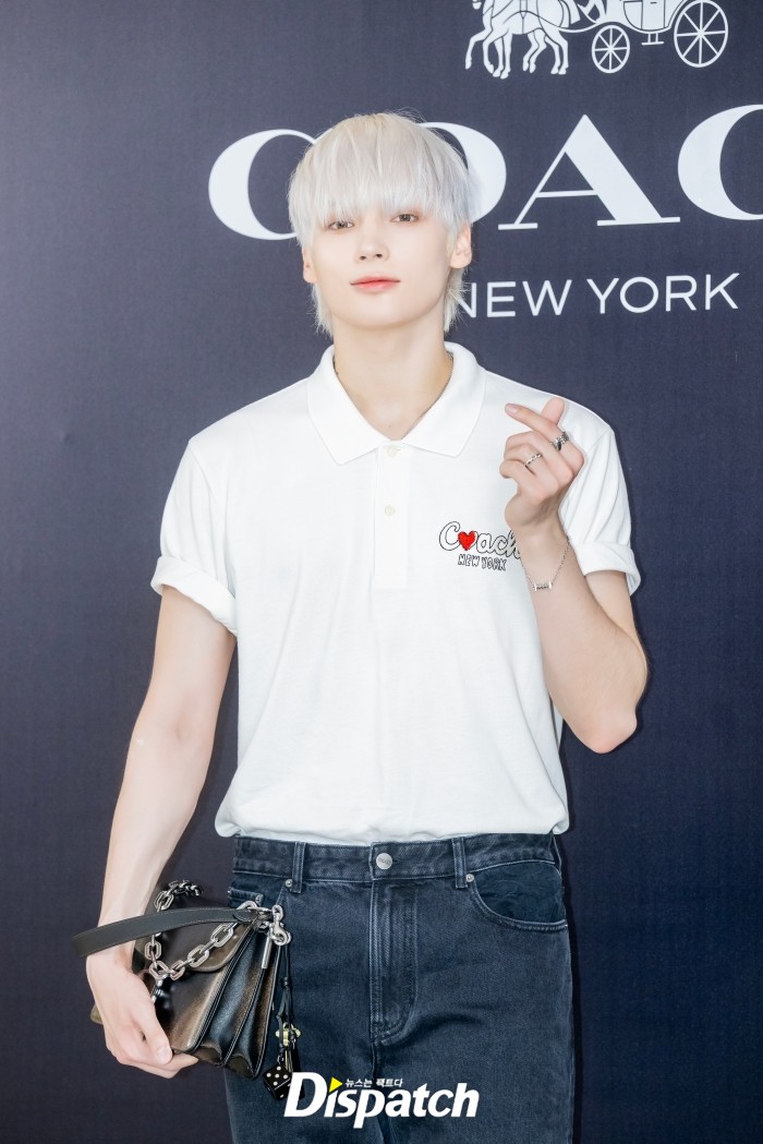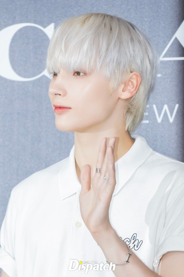 휴닝카이는 화이트 피케셔츠와 데님 팬츠로 멋을 냈다. 잘생긴 비주얼이 돋보였다.