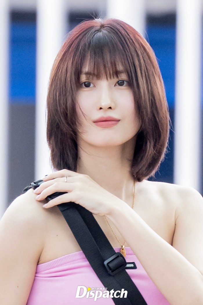 모모는 핑크 튜브탑과 그레이 오버핏 팬츠로 멋을 냈다. 섹시한 매력이 돋보였다.