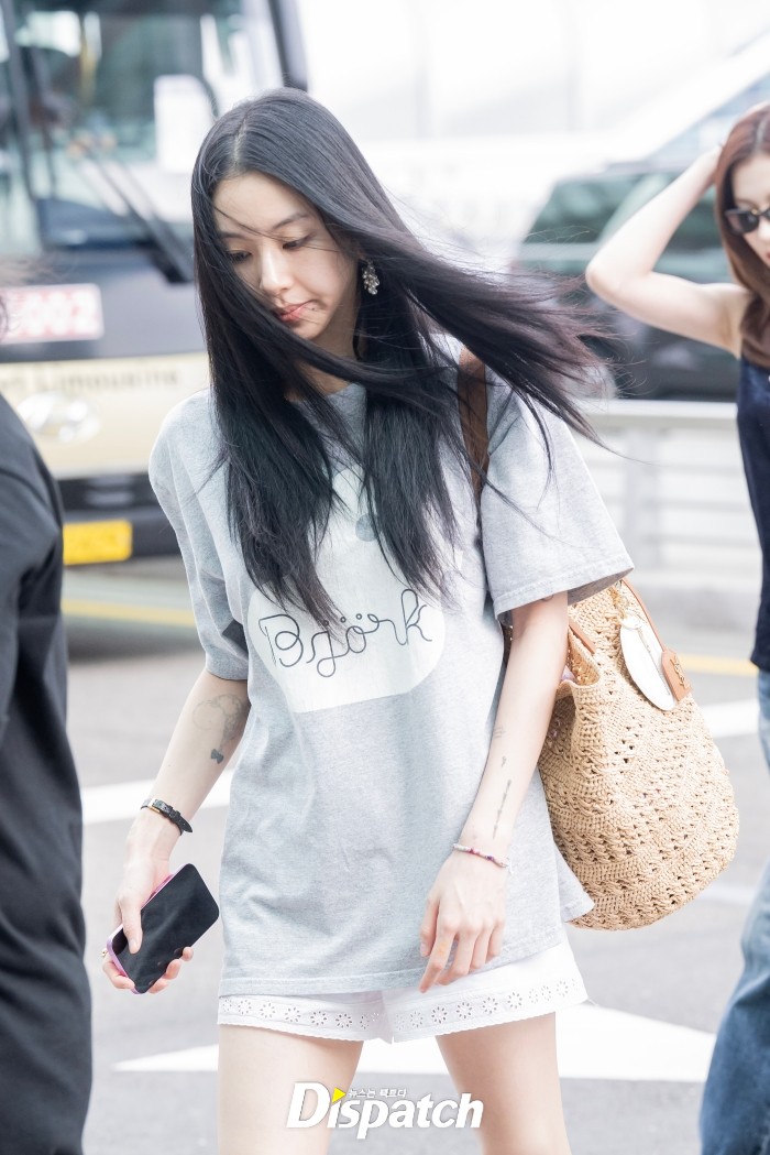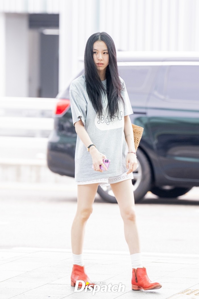 채영은 그레이 오버핏 티셔츠와 숏팬츠로 멋을 냈다. 가녀린 각선미가 시선을 사로잡았다.