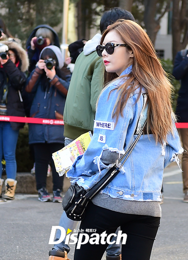 현아는 반전입니다. 이날은 '패왕색' 아닌 귀요미입니다. 연한 컬러의 청재킷에 블랙 스키니진을 받쳤습니다. 여기에 미니 크로스백으로 마무리.