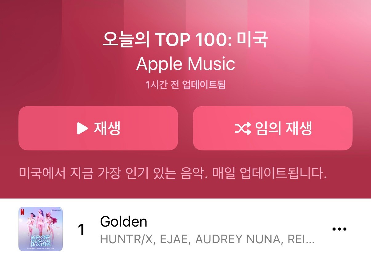 애플뮤직은 6일 오후 5시 '미국 일간 톱 100' 차트를 발표했다. '케데헌' OST '골든'이 1위를 차지했다. 케이팝 사상 최고 순위다.