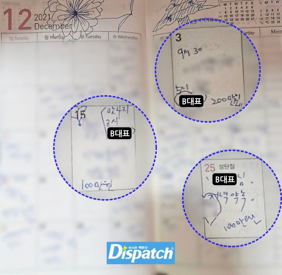 A대표는 (L씨와) 관계를 가질 때마다 100~300만 원을 줬다. L씨는 다이어리에 증거를 남겼다. ‘날짜’, ‘장소’, ‘금액’ 등을 기록했다.