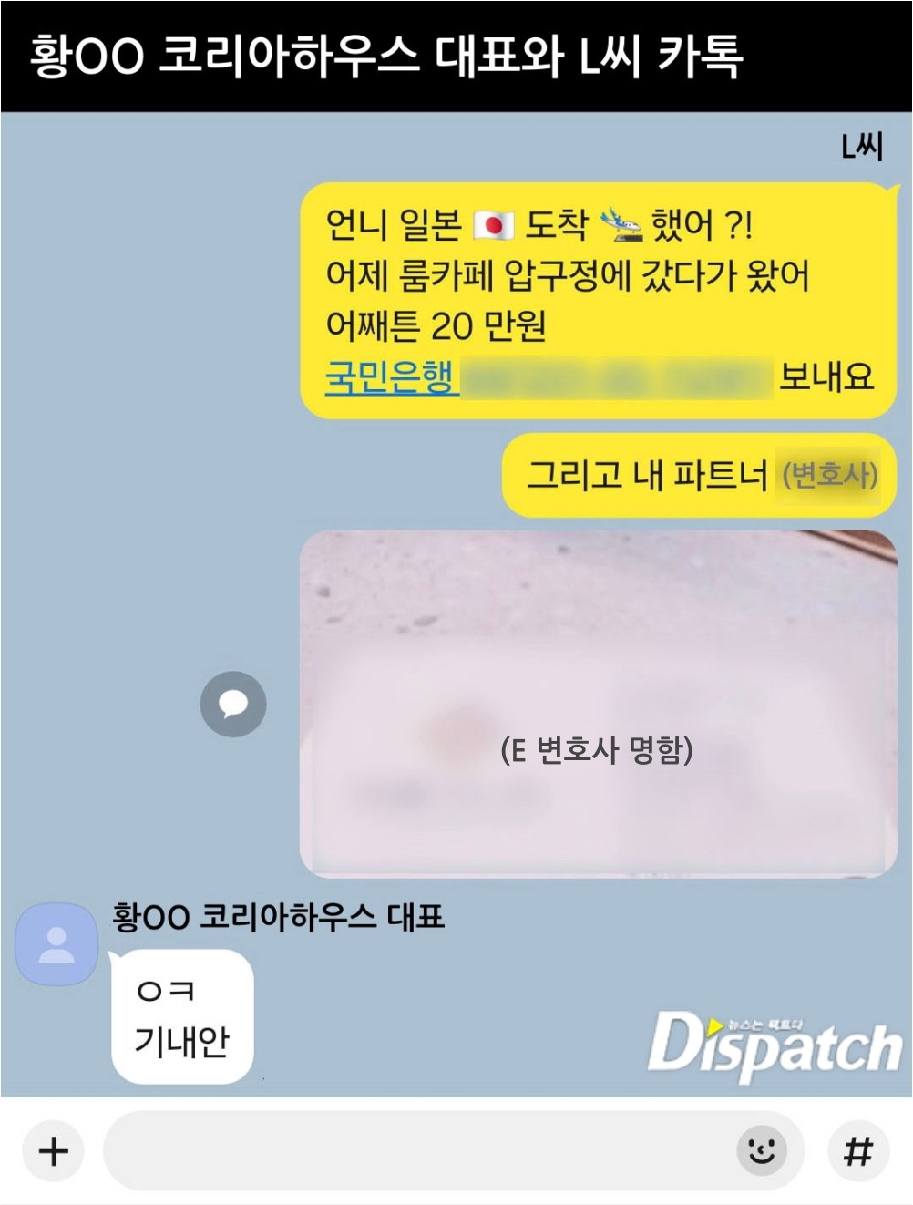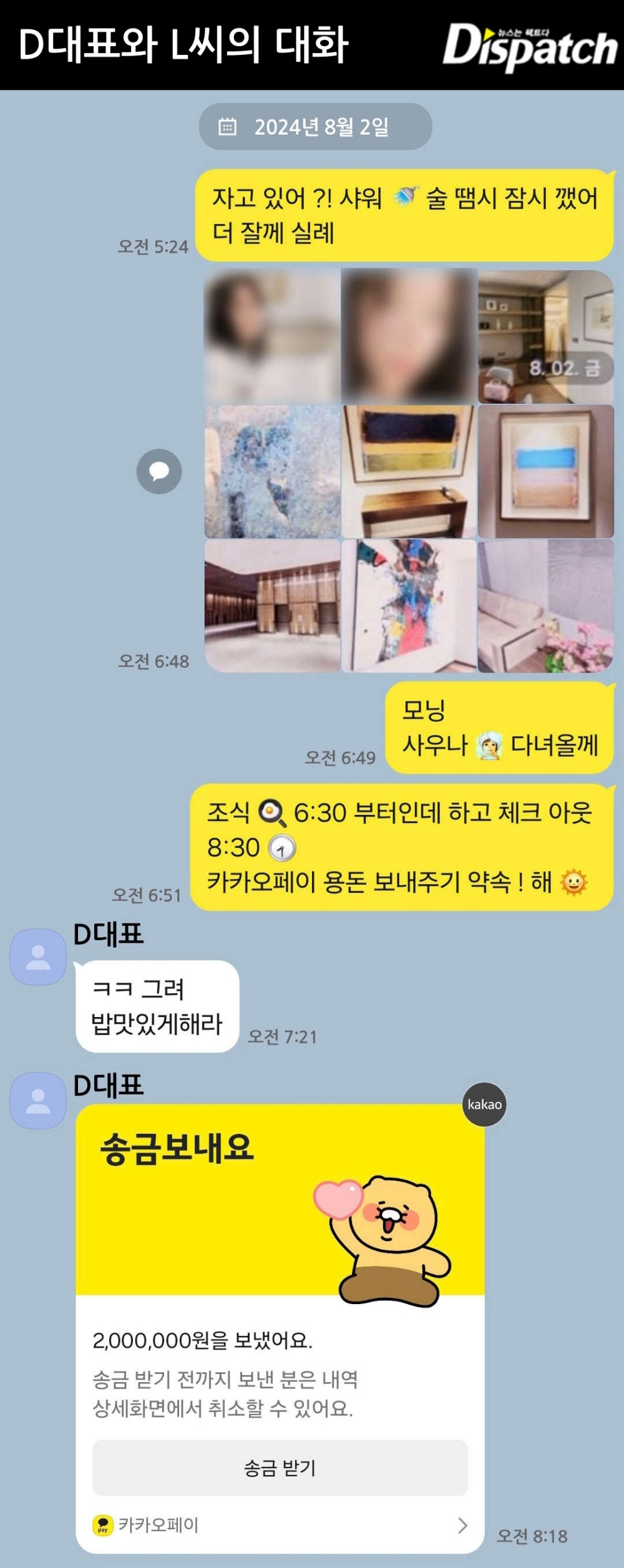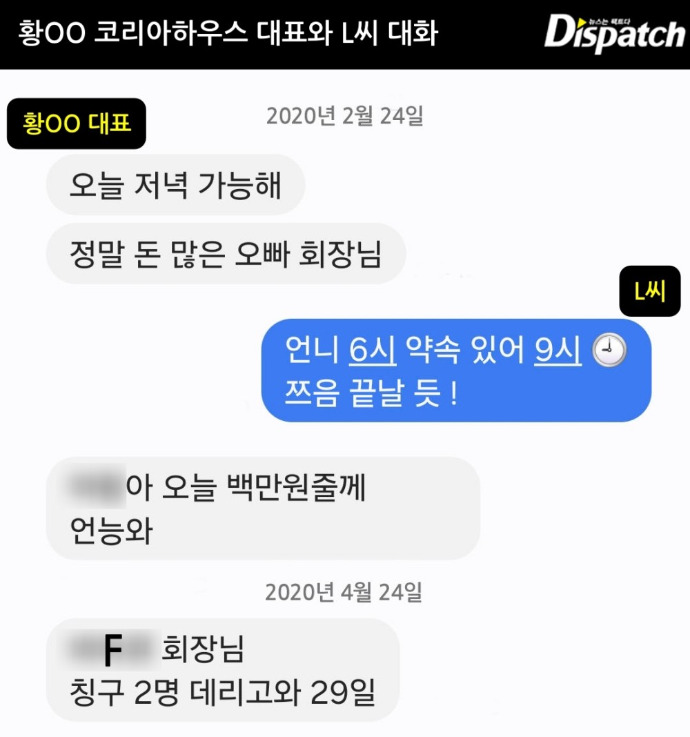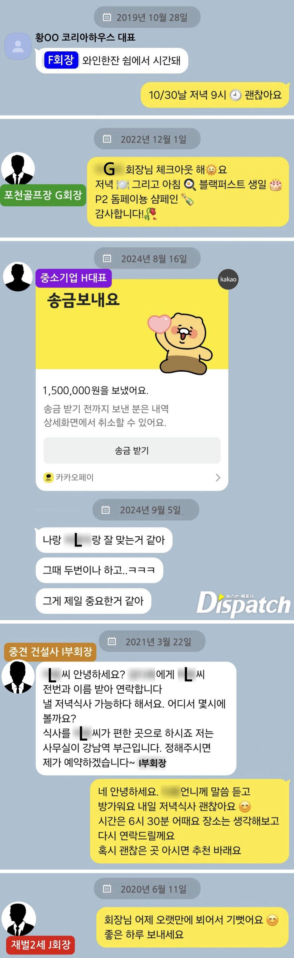 ‘디스패치’는 L씨의 카톡도 입수했다. 2022년부터 2024년까지, 돈을 받고 관계를 맺은 내용 등이 성매매의 증거로 남아 있었다.