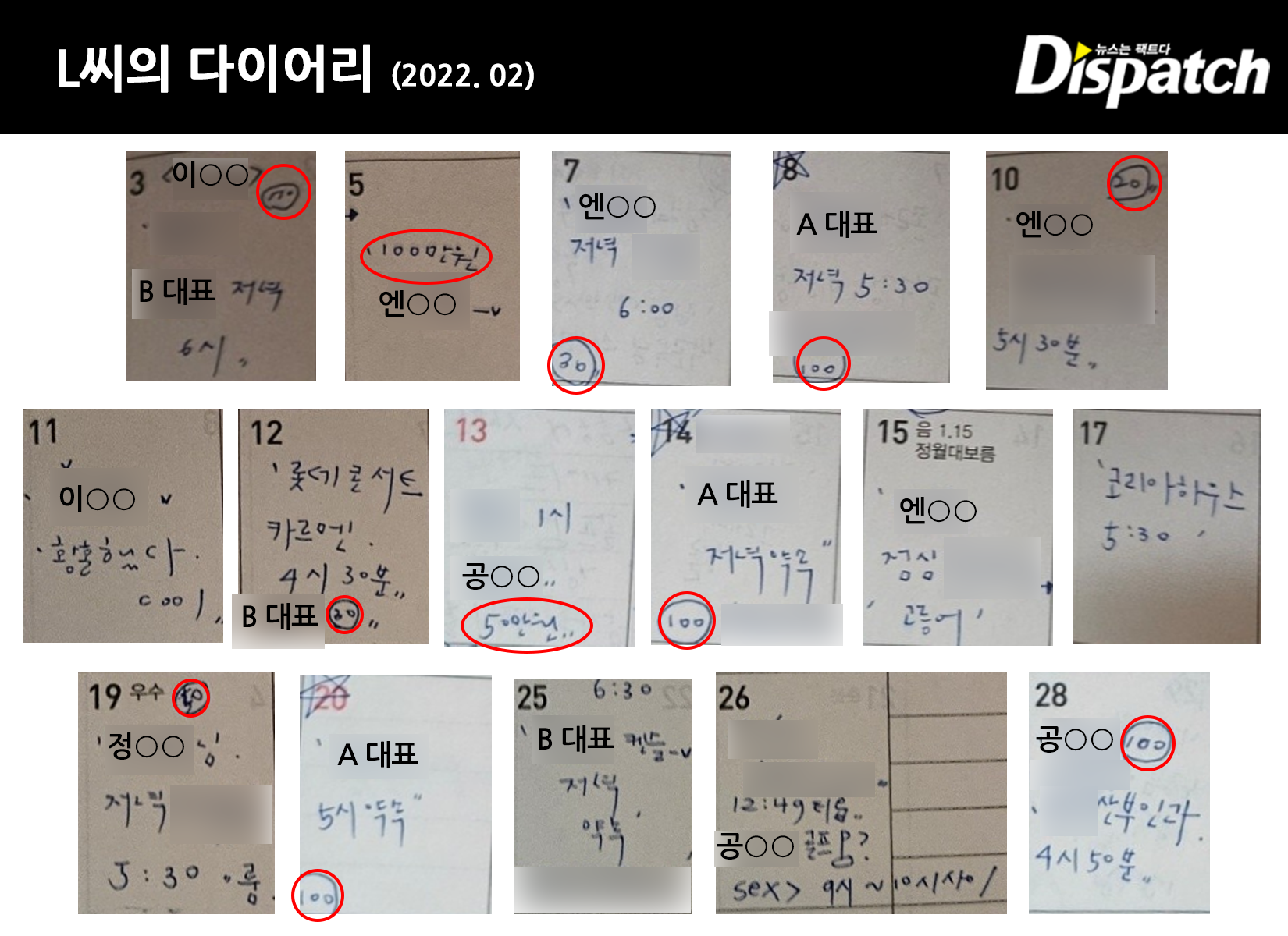 ‘디스패치’가 L씨의 다이어리를 공개한다. 의료기기 기업 A대표, 드라마 제작사 B대표, 레저그룹 C부회장, 벤처 캐피탈 D대표, 변호사 E씨, 요식 프랜차이즈 F회장, 포천 유명 골프장 G회장 등 총 25명의 이름이 등장한다. 그 중에서 돈을 주고 성매매를 나눈 사람은 최소 10명 이상이다.