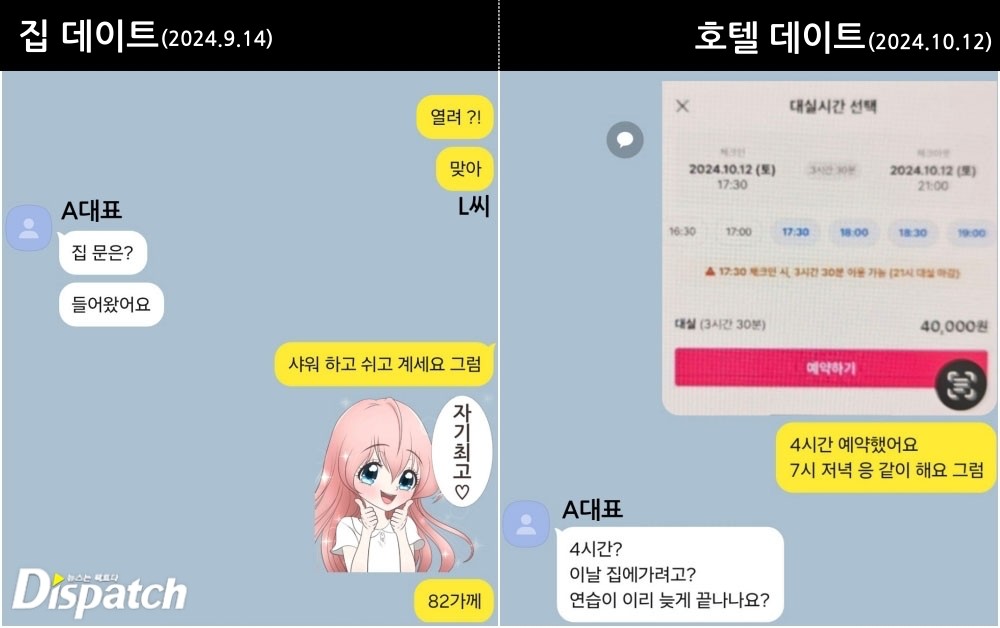 두 사람의 데이트 장소는 주로 호텔이었다. 가끔 L씨의 집에서 만나기도 했다. ‘디스패치’는 현관 비번을 공유하는 카톡도 입수했다.