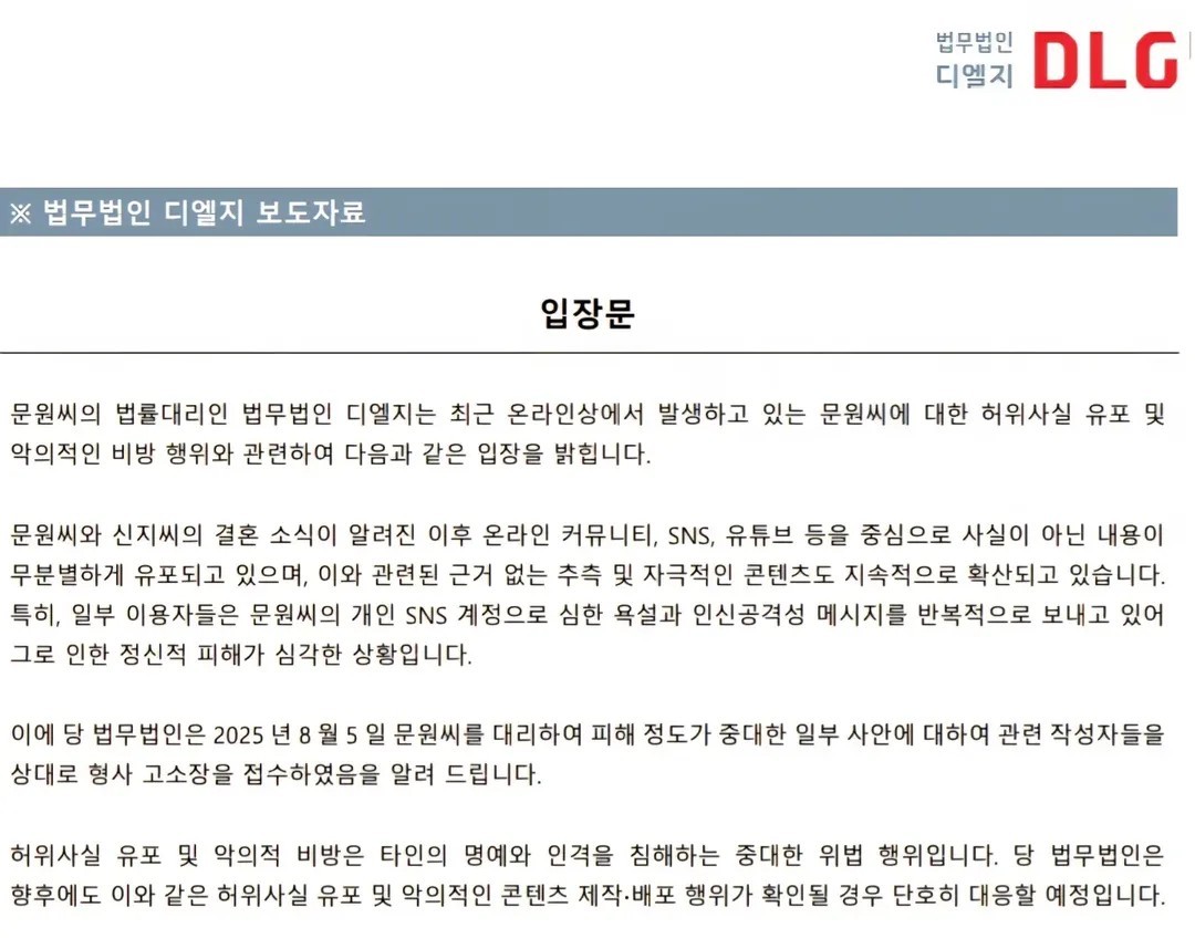 법무법인 DLG 측은 16일 문원 관련 입장문을 공개했다. "(두 사람의) 결혼 소식 공개 후 온라인을 중심으로 사실이 아닌 내용이 무분별하게 유포되고 있다"고 알렸다.