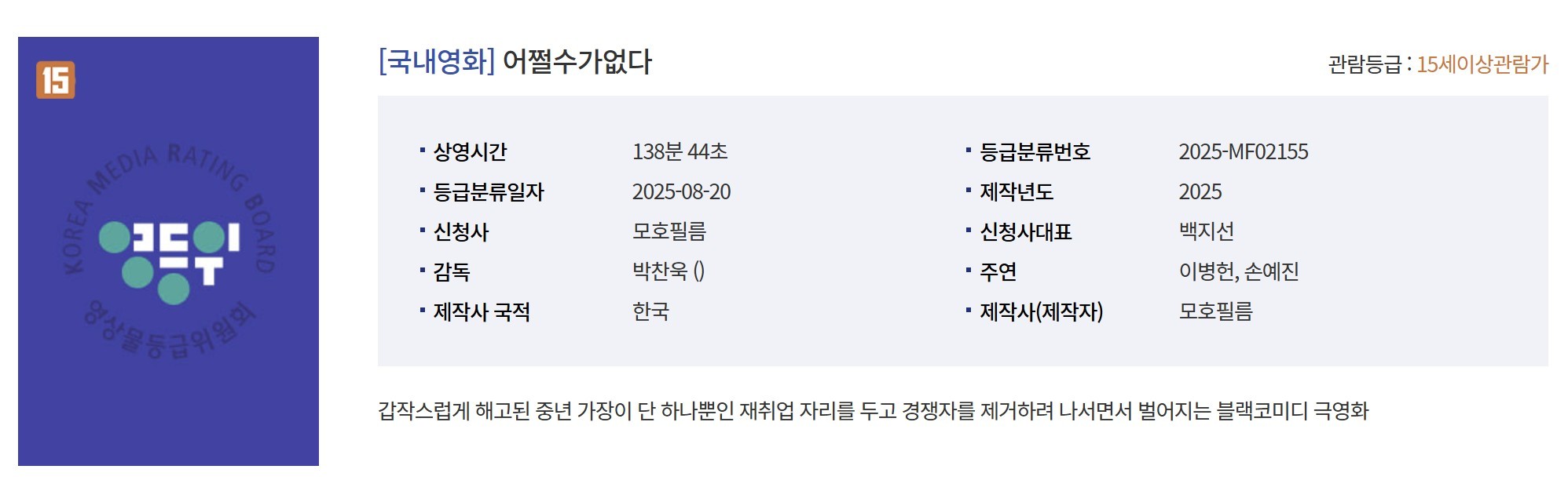 영상물등급위원회(영등위)는 지난 20일 '어쩔수가없다' 등급분류 결과를 발표했다. 이번 작품은 15세 이상 관람가로 확정됐다.