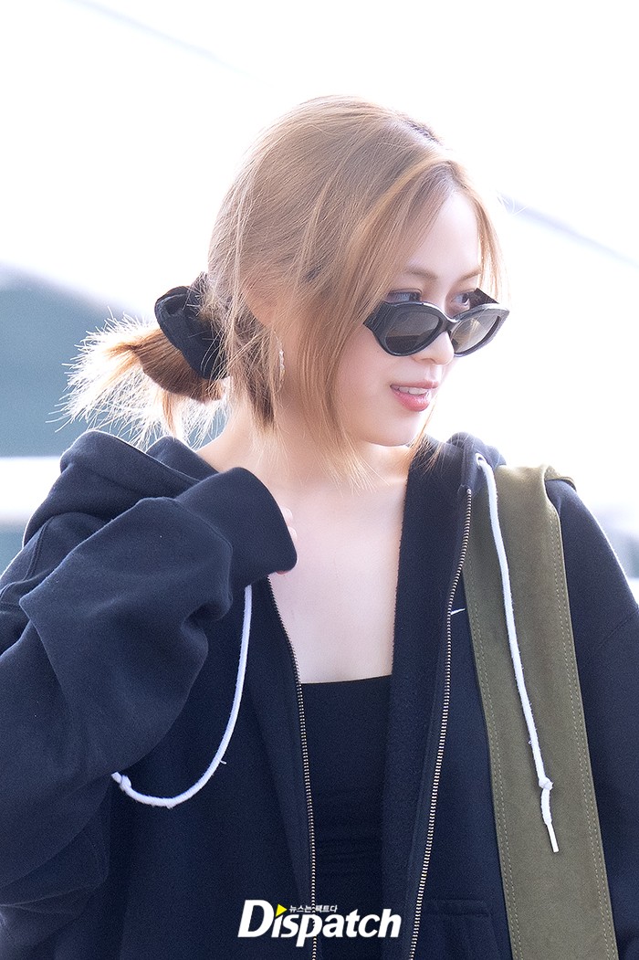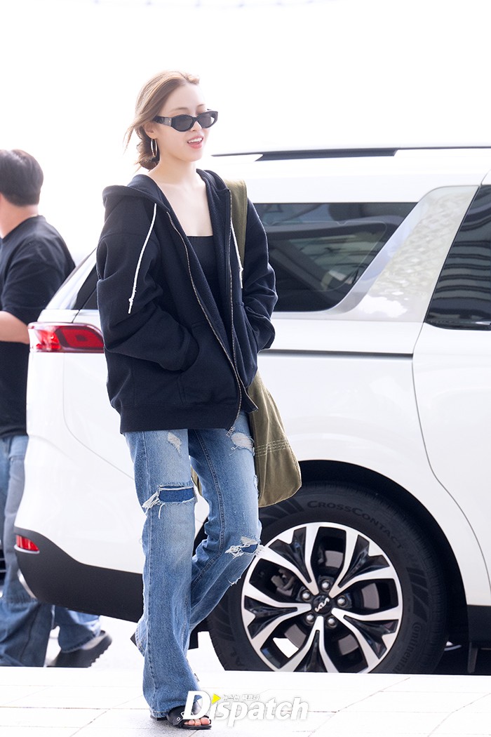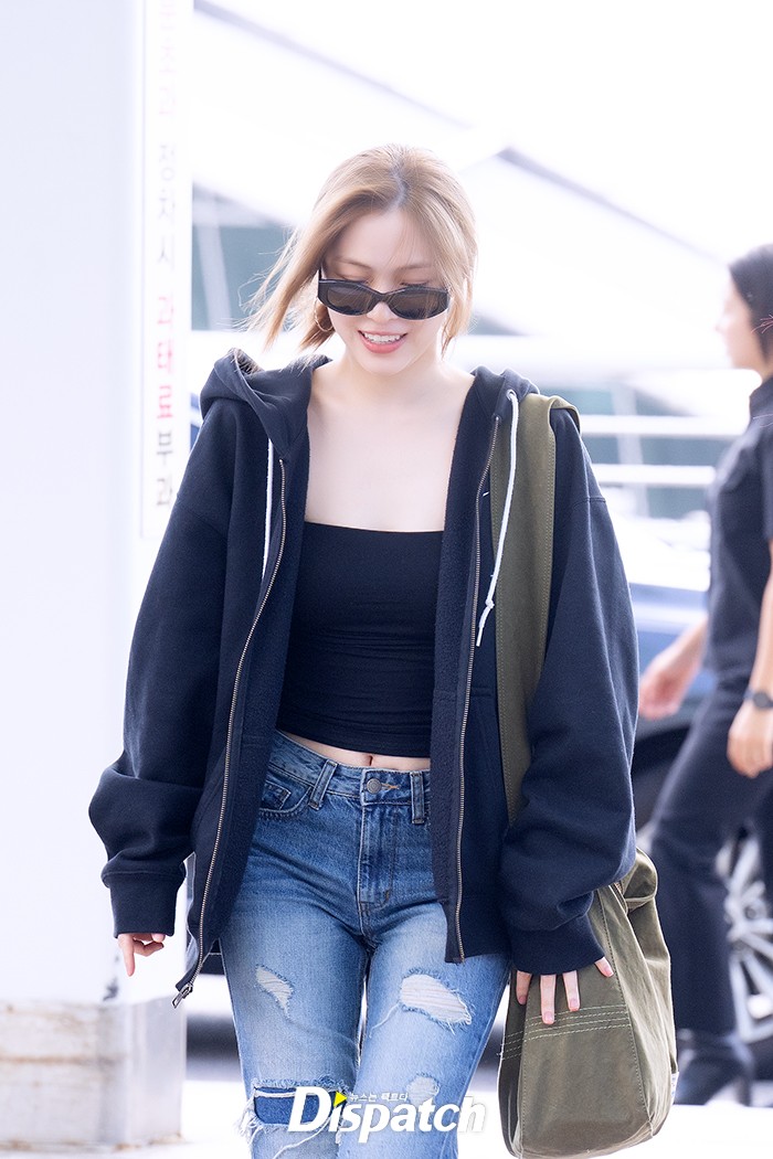 류진은 데님 팬츠에 크롭톱, 후드 티셔츠를 매치해 시크한 공항패션을 연출했다. 인형같은 미모가 돋보였다.