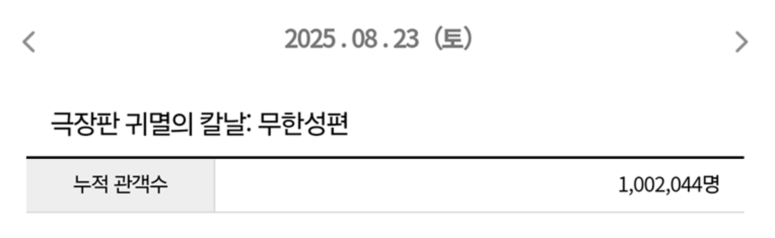영진위 영화관입장권 통합전산망에 따르면, '극장판 귀멸의 칼날: 무한성편'(이하 '귀멸의 칼날')은 23일 오후 1시 55분경 관객 100만 명을 넘겼다.