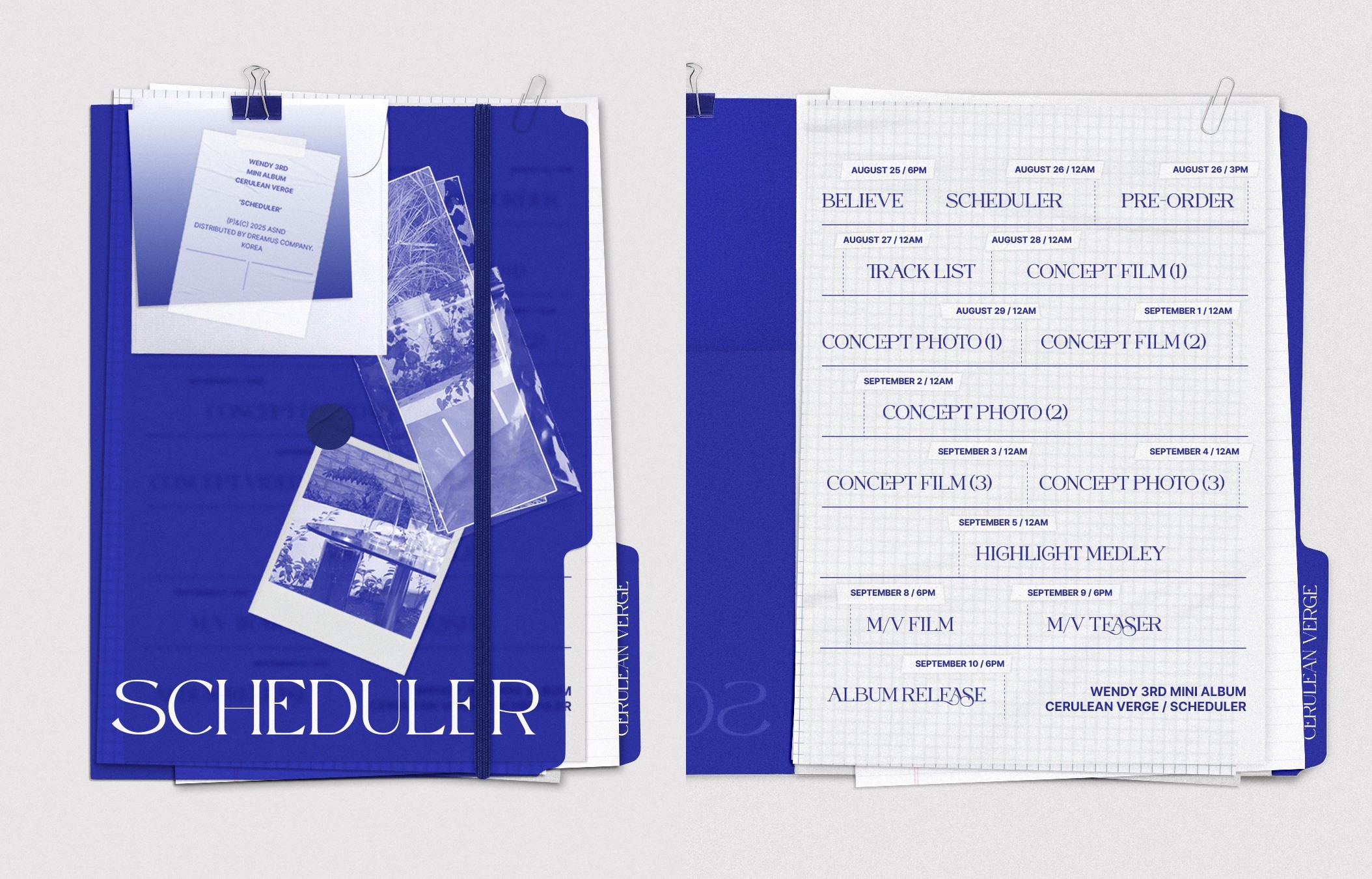 웬디는 26일 SNS에 3번째 미니앨범 '세룰리안 버지'(Cerulean Verge) 스케줄러 이미지를 올렸다. 푸른색 노트 위에 콘텐츠 일정이 적혀 있었다.