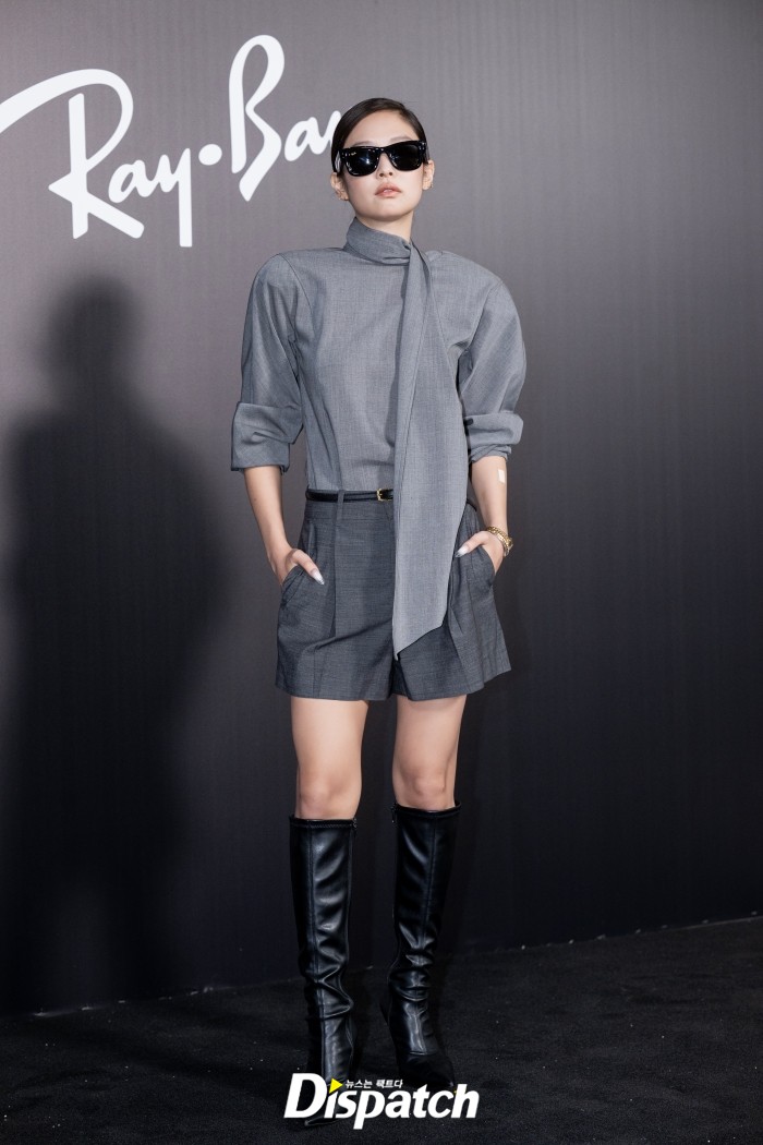 제니는 그레이 블라우스와 팬츠, 가죽 부츠로 멋을 냈다. 시크한 매력이 돋보였다.