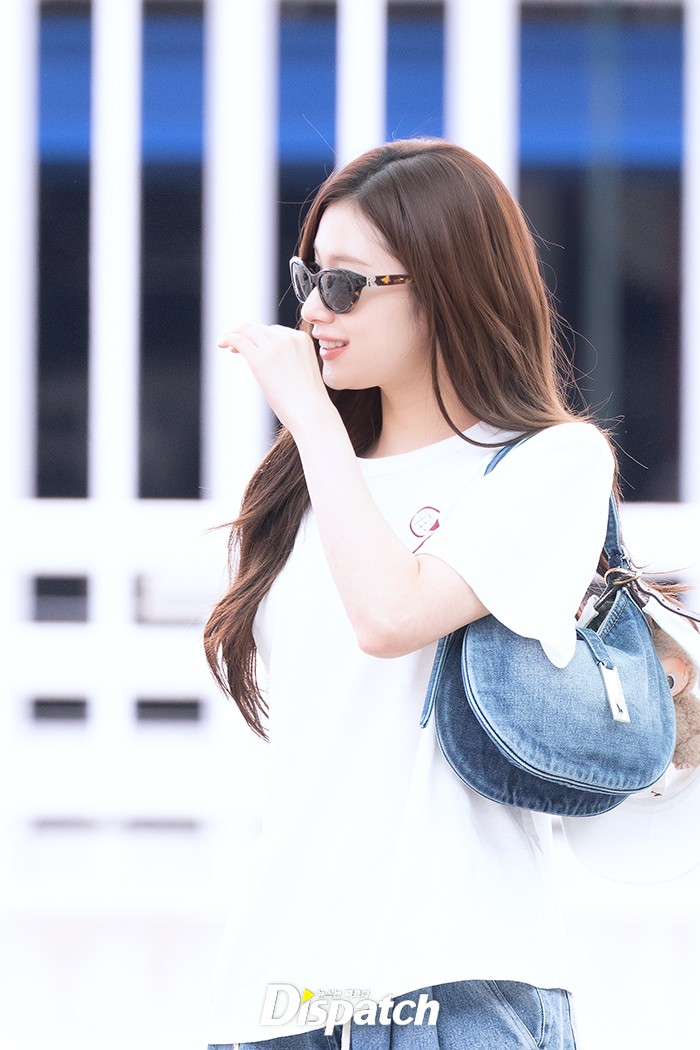사나는 데님 팬츠에 티셔츠를 매치해 심플한 공항패션을 연출했다. 인형같은 미모가 돋보였다.