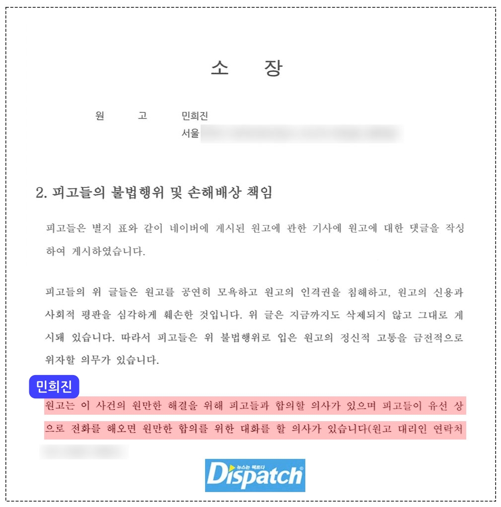 ‘디스패치’는 최근 민희진 측이 네티즌에게 보낸 고소장을 입수했다. 민희진 관련 기사에서 ‘년’이라는 욕설이 들어간 댓글을 채증, 300~400만원을 배상액으로 청구했다.