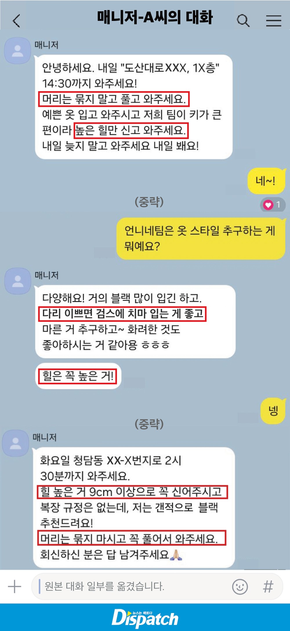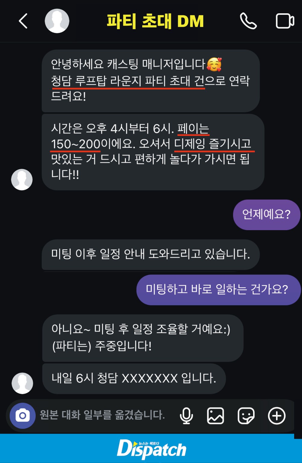 '디스패치'는 매니저가 보낸 초대 문자를 확보했다. (파티에 참석한 여성들은 모집책을 매니저라 불렀다.)