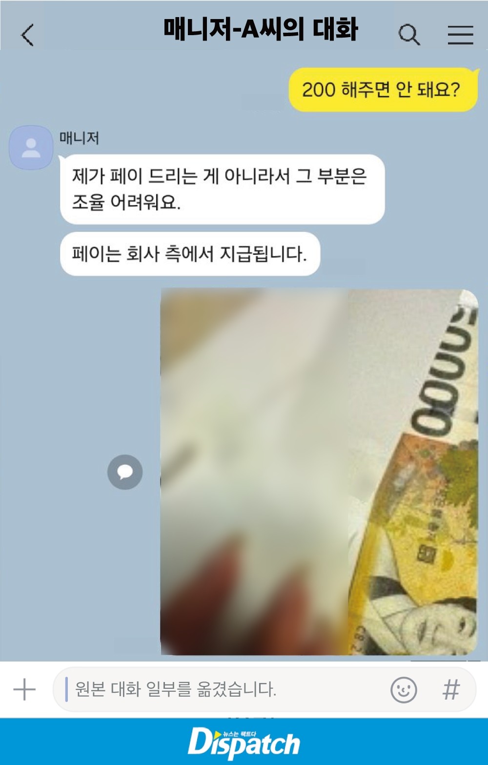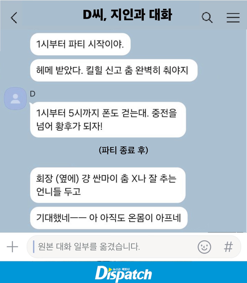 '디스패치'는 D씨가 지인에게 보낸 카톡을 입수했다. 눈물겨운 노력이 엿보였다. 동시에, 파티장 분위기를 간접적으로 느낄 수 있었다.