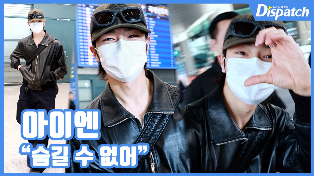 이날 아이엔은 블랙 레더 재킷과 블랙 팬츠로 시크한 올 블랙 공항패션을 선보이며, 훈훈한 눈빛으로 막내의 사랑스러운 매력을 더했다.