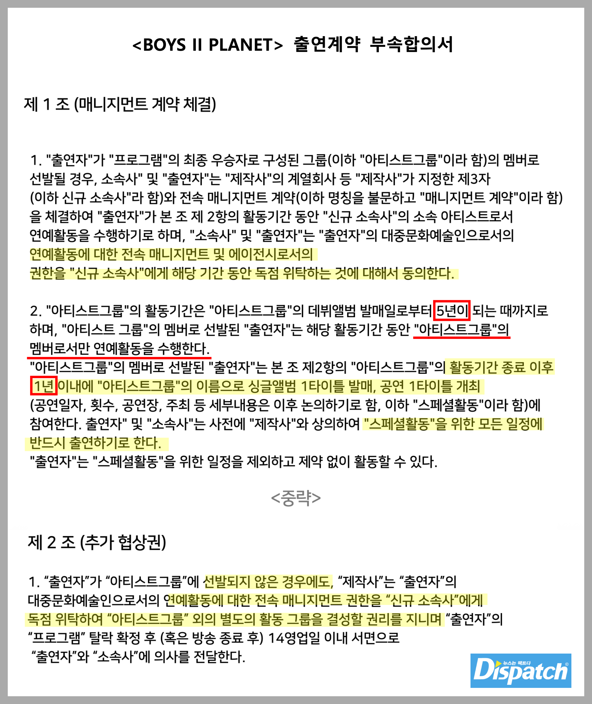 "출연자가 최종 선발되지 않은 경우에도 CJ ENM은 출연자의 연예 활동에 대한 전속 매니지먼트 권한을 독점 위탁해 별도 그룹을 결성할 권리를 지닌다." (2조 1항)