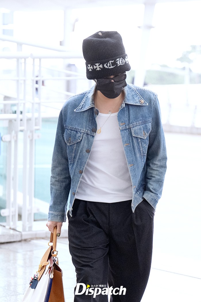 지드래곤은 블랙 팬츠에 데님 재킷으로 개성 넘치는 공항패션을 연출했다. 훈훈한 비주얼이 돋보였다.