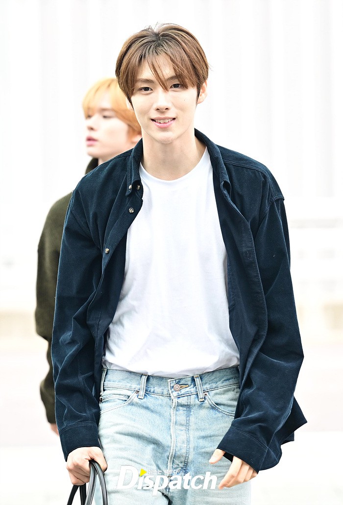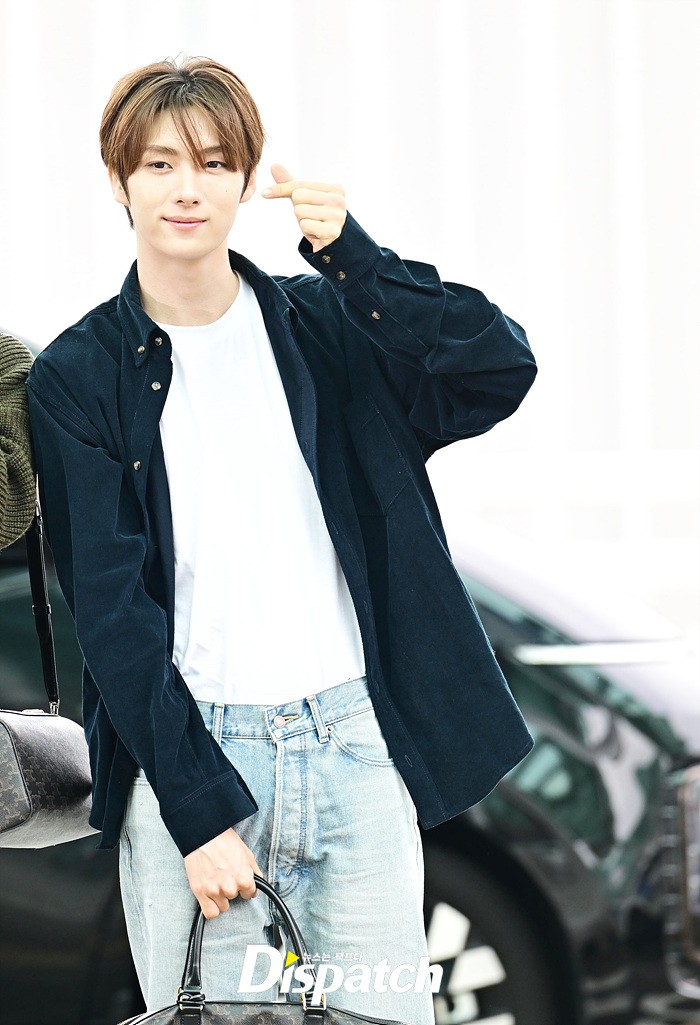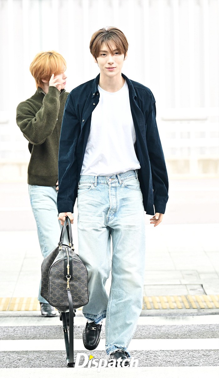 영재는 네이비 컬러의 셔츠와 데님진으로 캐주얼한 공항패션을 연출했다. 스윗한 미소와 훈훈한 비주얼도 돋보였다.