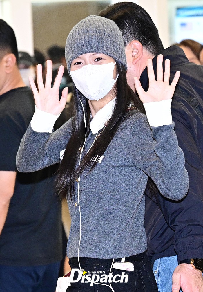 지수는 그레이 컬러의 재킷과 블랙 와이드진으로 세련된 공항패션을 완성했다. 마스크에도 러블리한 미소가 돋보였다.