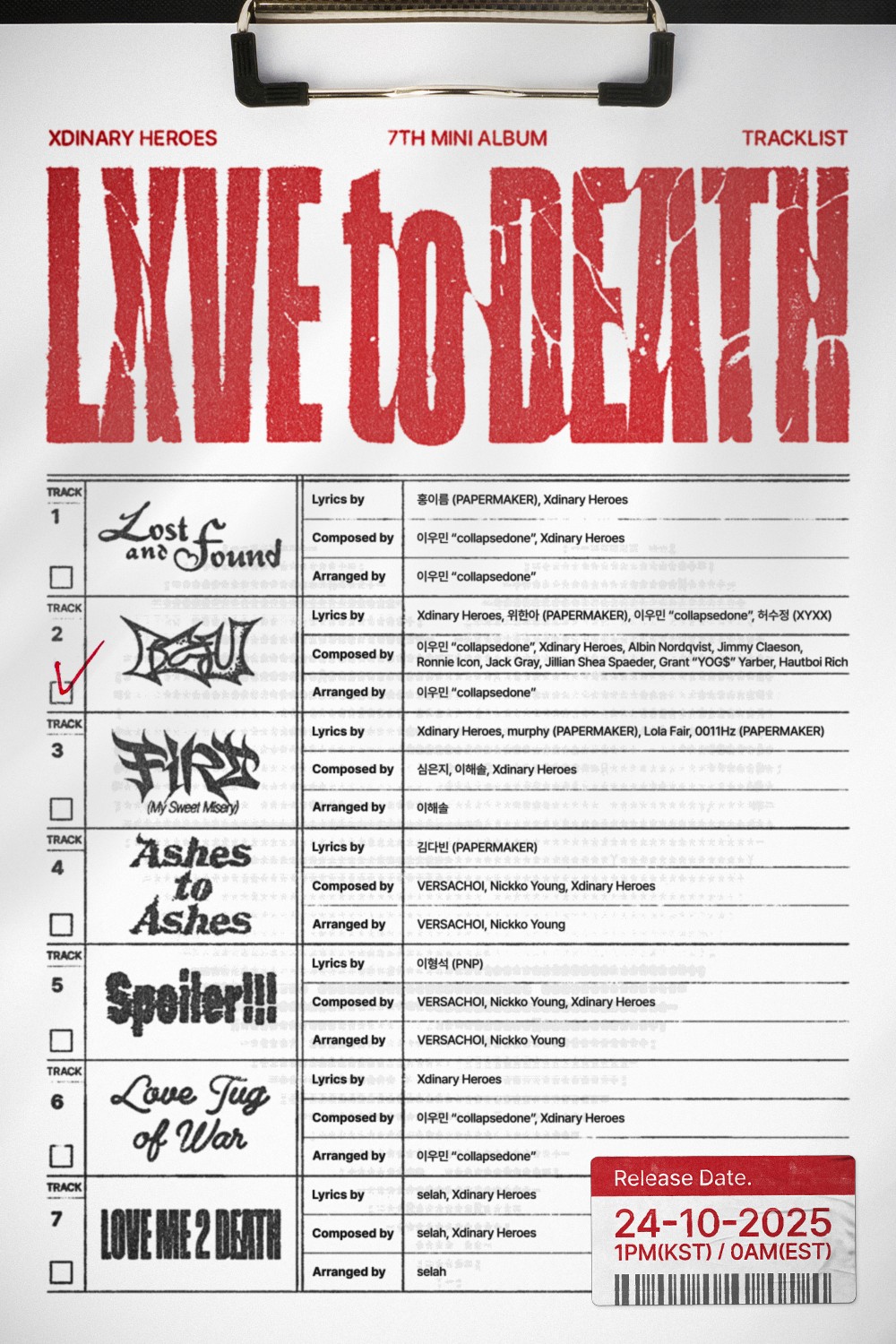 JYP엔터테인먼트는 10일 엑스디너리 히어로즈 SNS에 새 미니 앨범 '러브 투 데스'(LXVE to DEATH'(러브 투 데스) 트랙리스트 이미지를 올렸다.