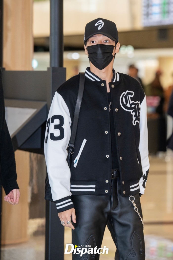 우영은 스테디움 재킷과 레더 팬츠로 멋을 냈다. 잘생긴 비주얼이 돋보였다.