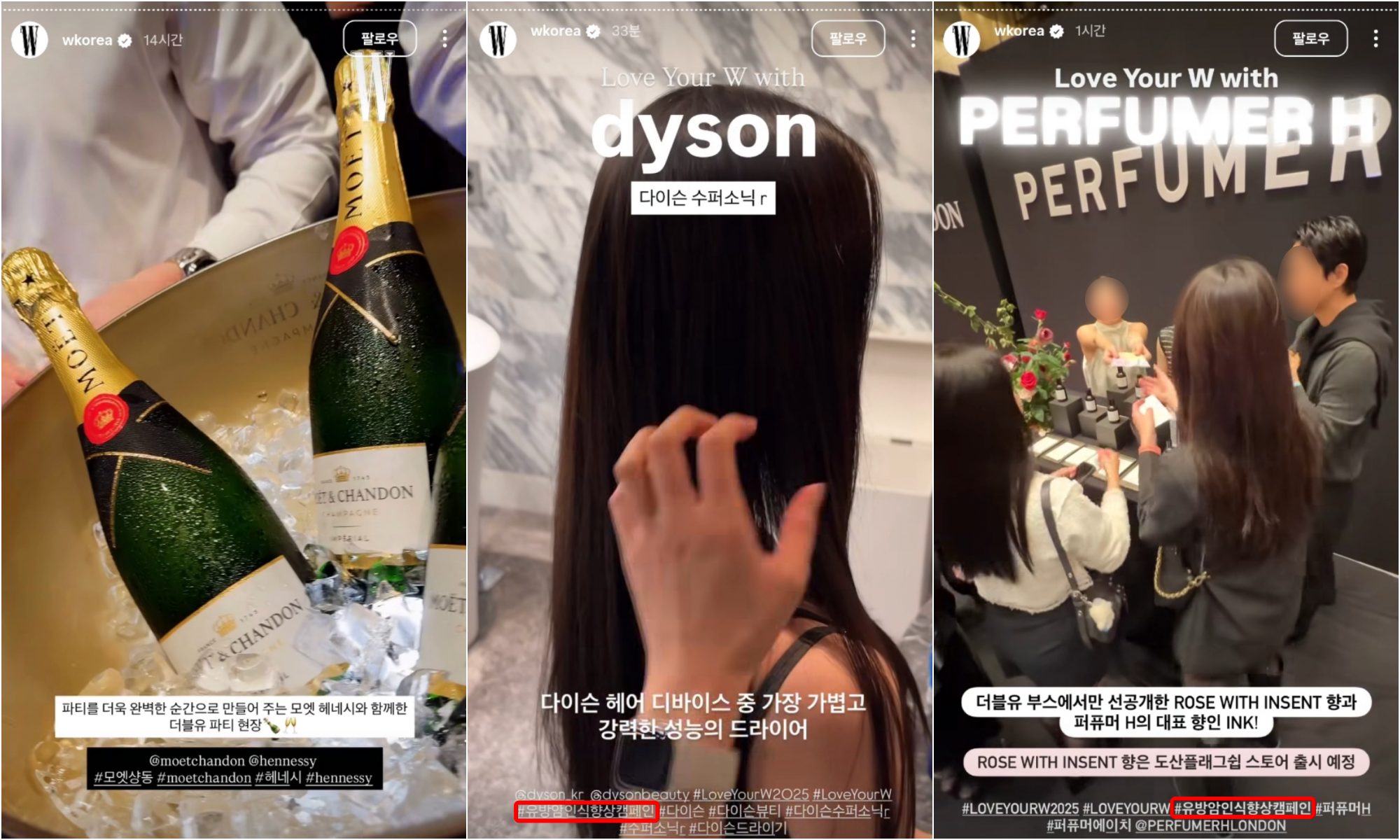W코리아는 10억 원 가까이 기부금을 모은 것으로 추정된다. 게다가 다이슨, 모엣샹동, 퍼퓨머 H 등을 별도 업로드했다. '강력한 성능의 드라이어', '파티를 완벽하게 만들어주는 샴페인' 등의 멘션도 덧붙였다.